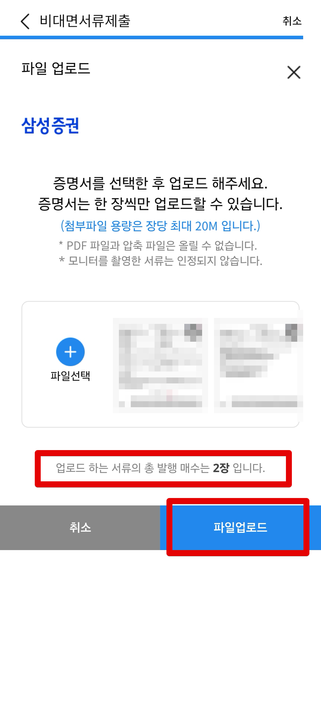 증명서를 선택한 후 한 장씩 제출해주고 파일 업로드를 해주면 신청이 완료된다.