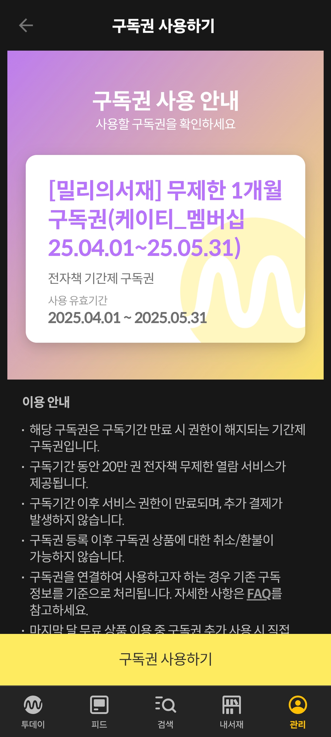 밀리의서재 앱에서 [구독권 등록 및 사용]으로 들어간 다음 구독권 복사붙여넣기해서 등록해준다.