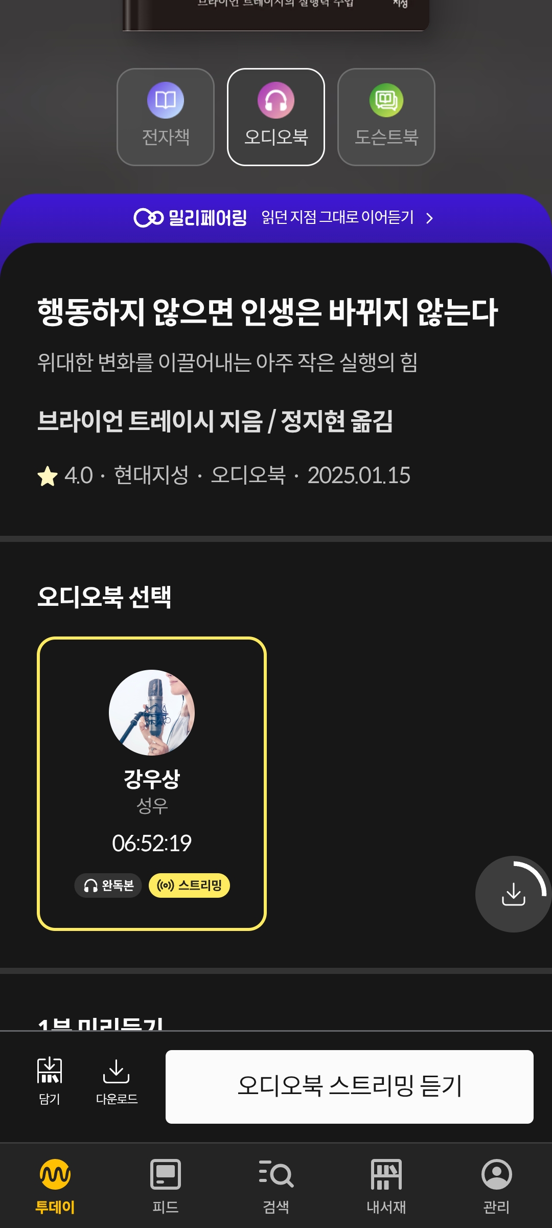 이제 밀리의서재 1개월 무료로 사용 가능! 오디오북 듣기의 경우 다운로드 후 듣기만 있었는데 이제는 오디오북 스트리밍 듣기도 추가된 듯 하다.