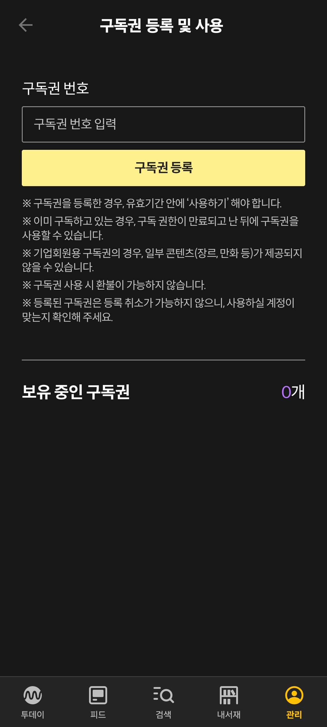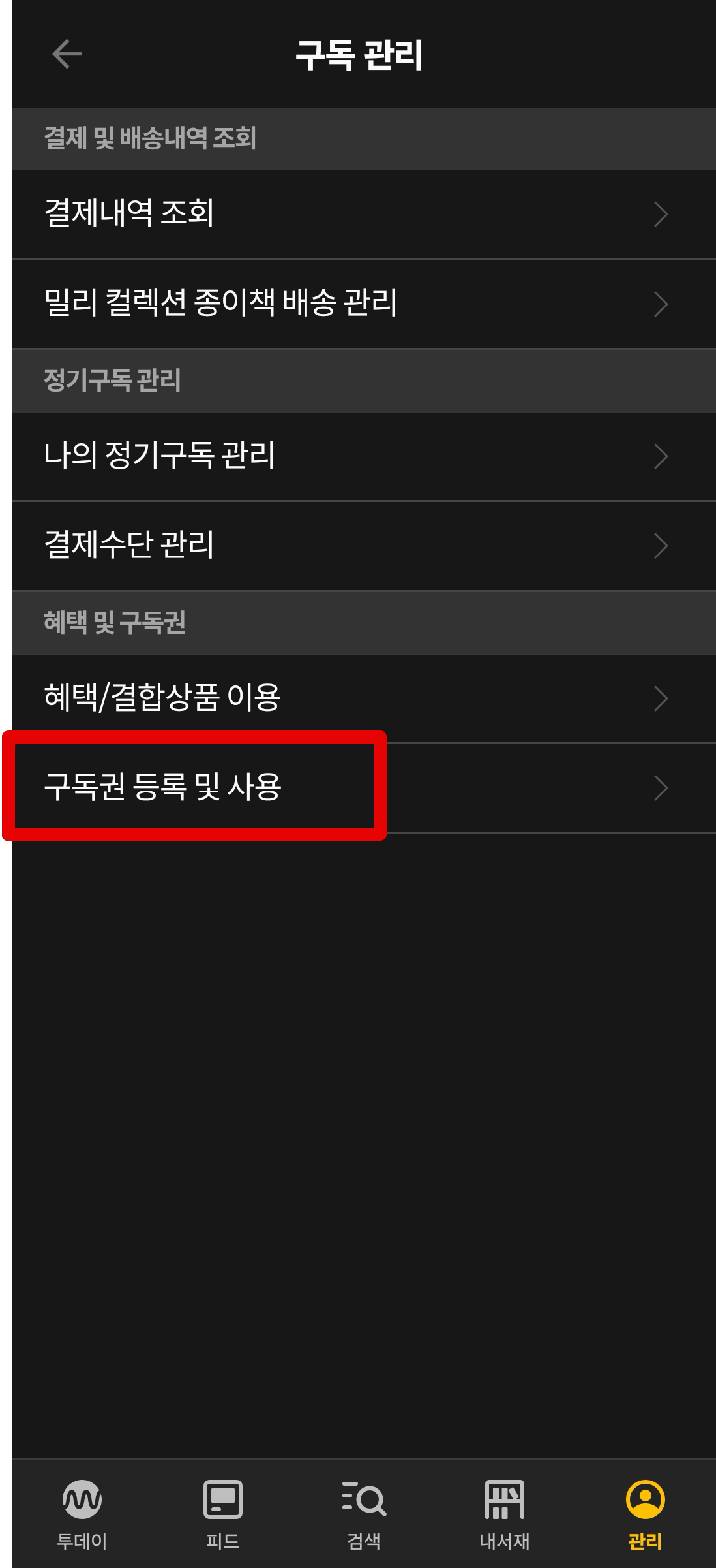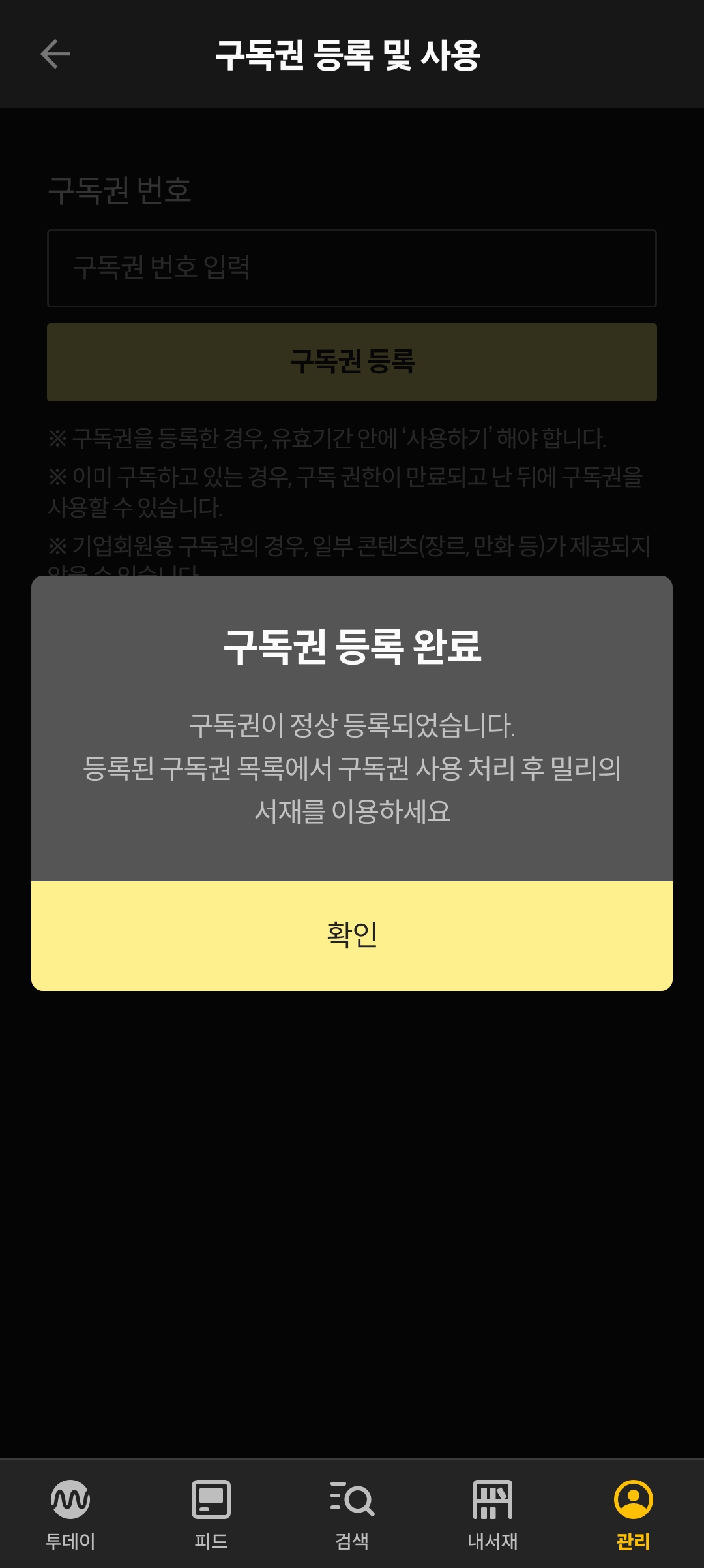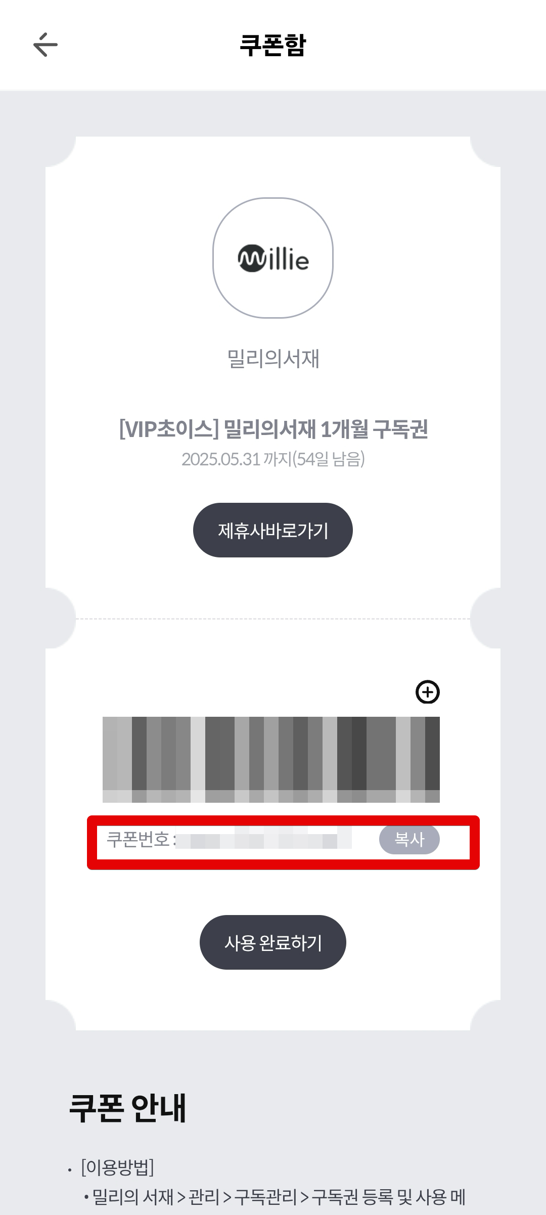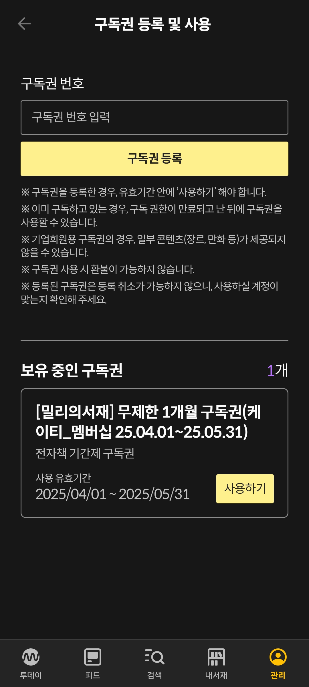 밀리의서재 앱에서 [구독권 등록 및 사용]으로 들어간 다음 구독권 복사붙여넣기해서 등록해준다.