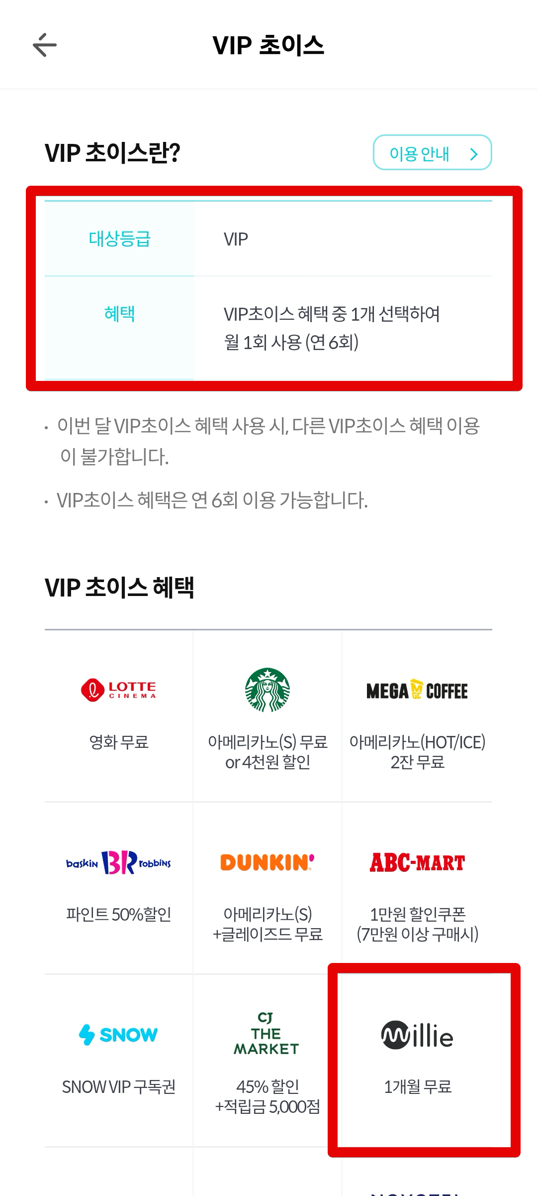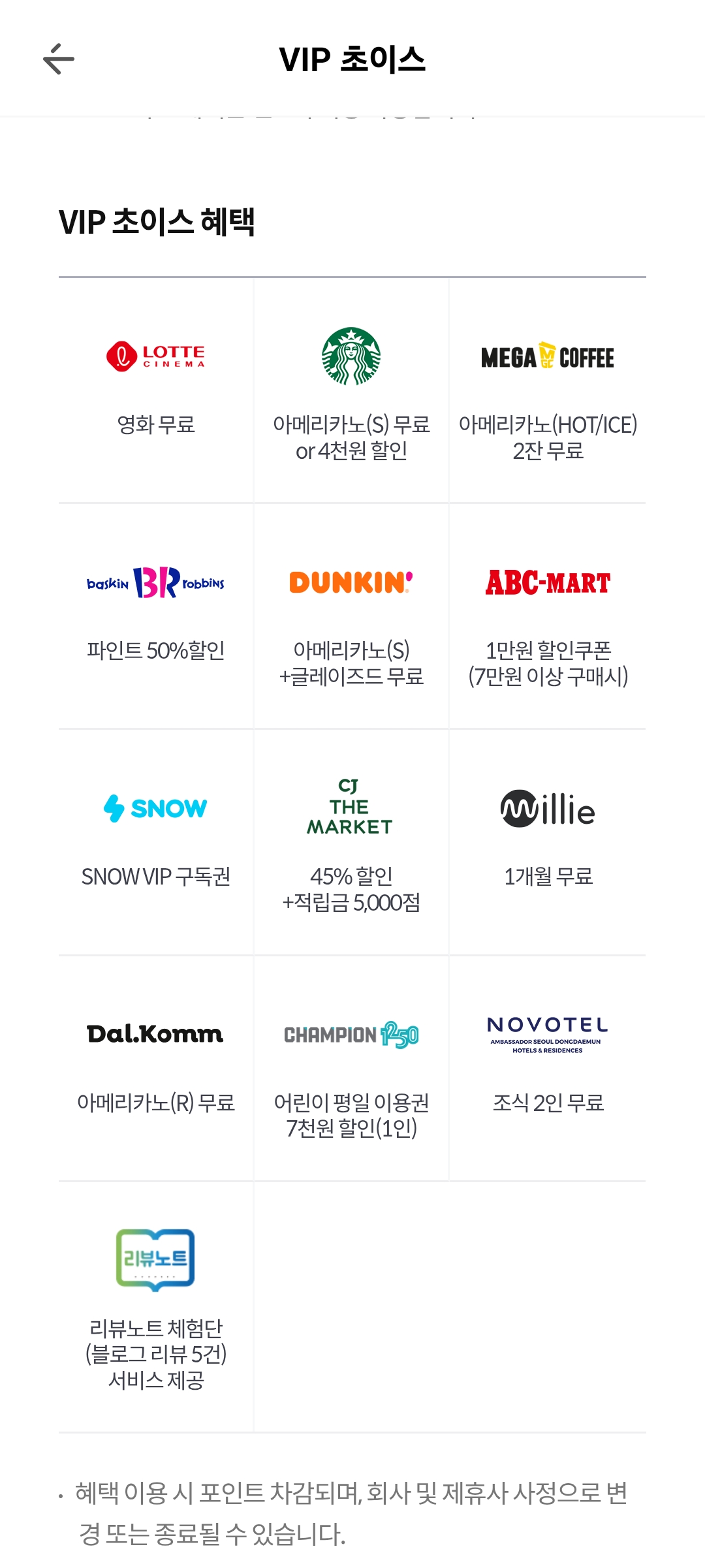 VIP 초이스 혜택에서는 1개월 무료를 받을 수 있다. VVIP는 3개월 무료짜리가 제공된다. VIP 초이스에서는 멤버십 포인트 4000점을 차감하게 된다. 어차피 남는거다.