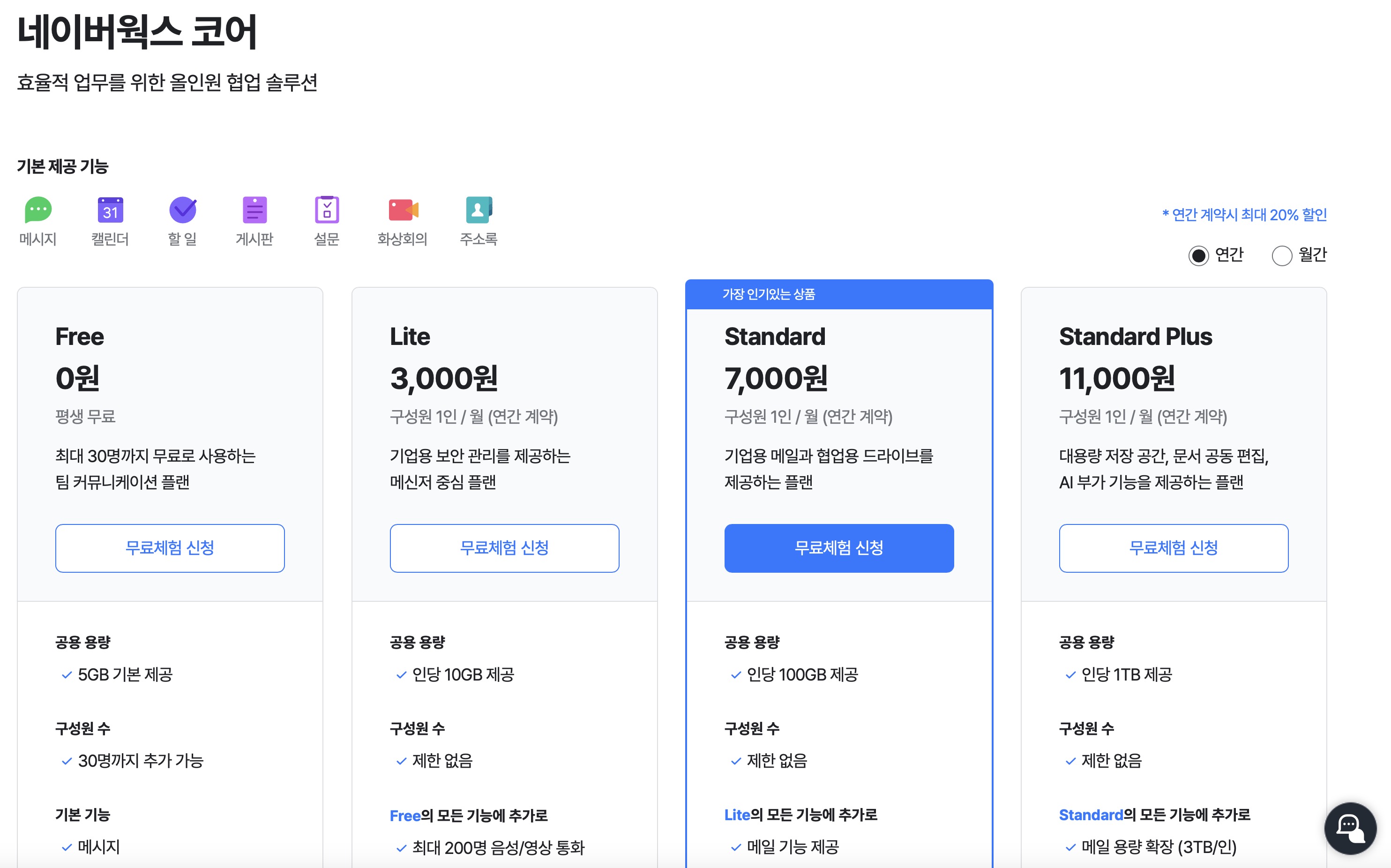 지금 회사에서는 네이버웍스 코어(예전이름 네이버웍스) 스탠다드 상품을 쓰고 있는데 기본으로 드라이브용량 1TB를 주고 1인당 100GB를 추가로 준다. 그래서 1명일 때, 1.1TB의 용량을 가질 수 있다. 월 7000원 표기이지만 부가세 제외금액이므로 실제로는 7700원이라고 봐야한다. 여기에 클라우드를 2TB로 맞추고 싶으면