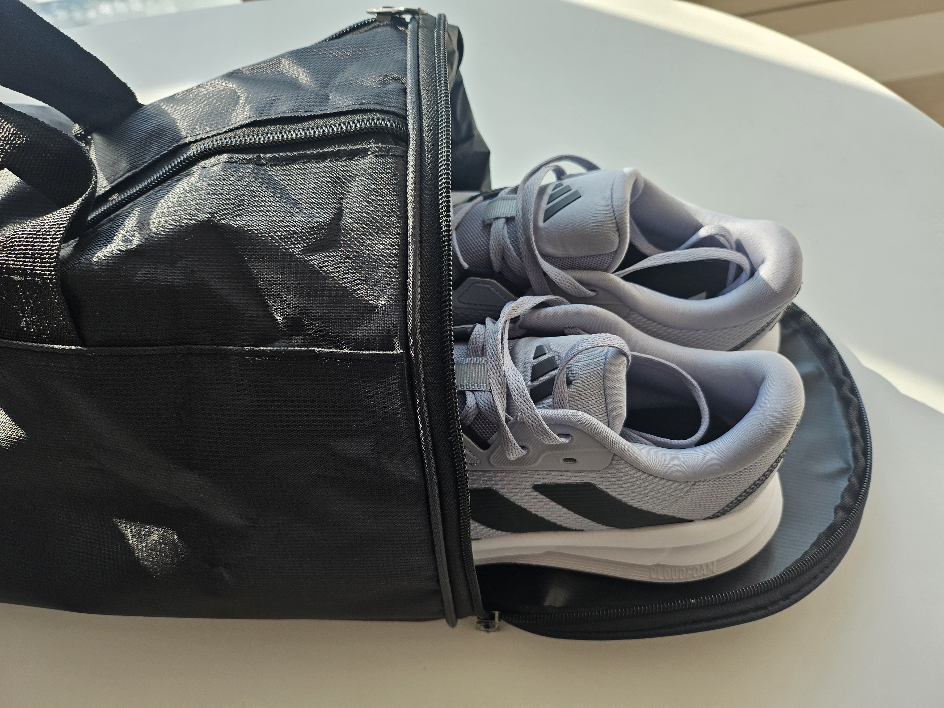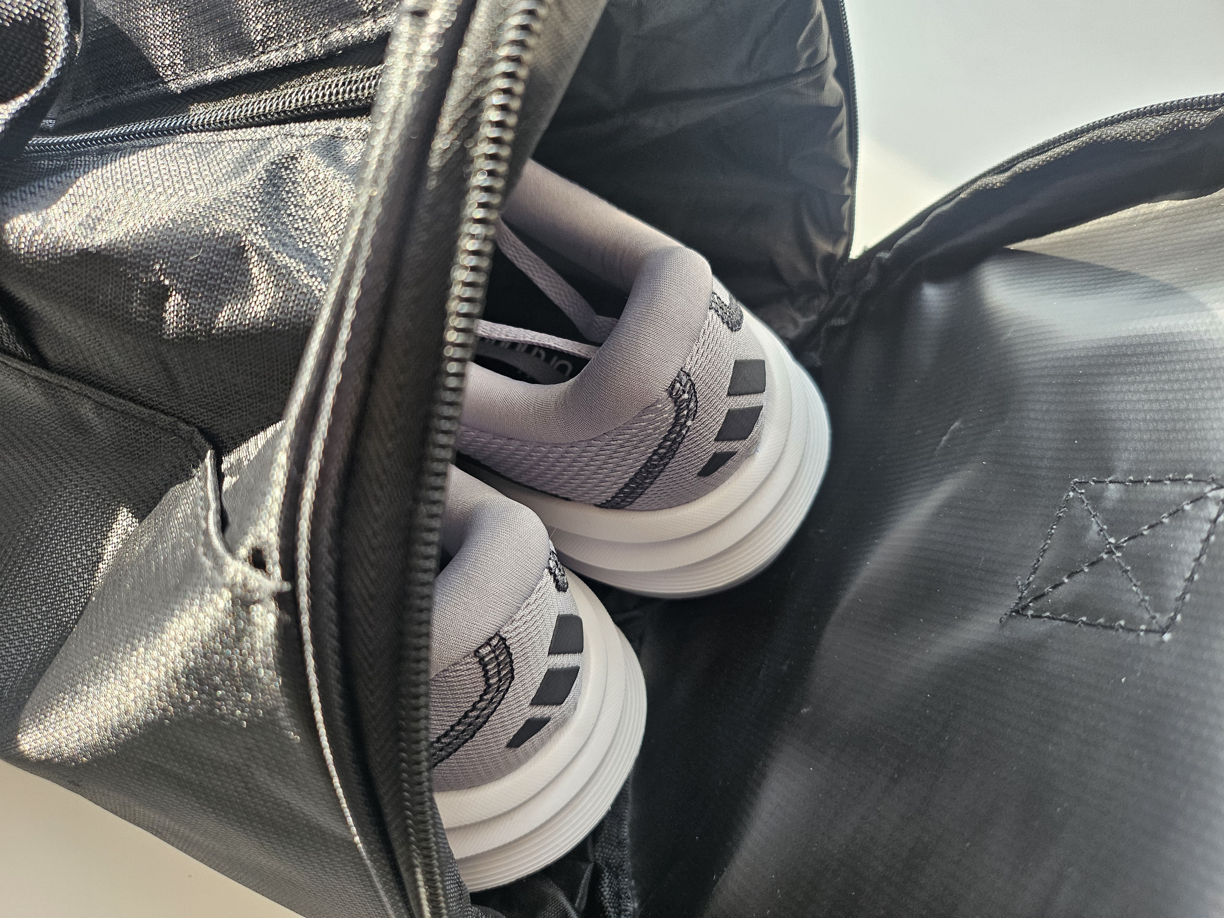 이렇게 신발을 가방에 쏙 넣어주면 된다. 그리고 나머지 공간에는 헬스할 때 쓸 거 이것저것 넣어두는데, 헬스장 갈 땐 이제 이 가방 하나만 딱 들고가면 이것저것 챙길 필요없이 클리어. 굿.