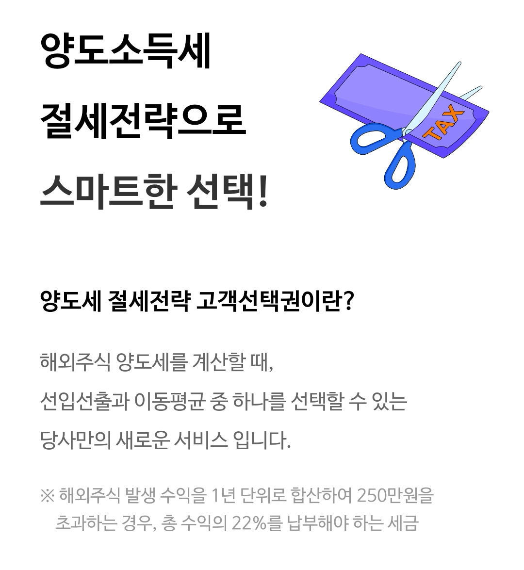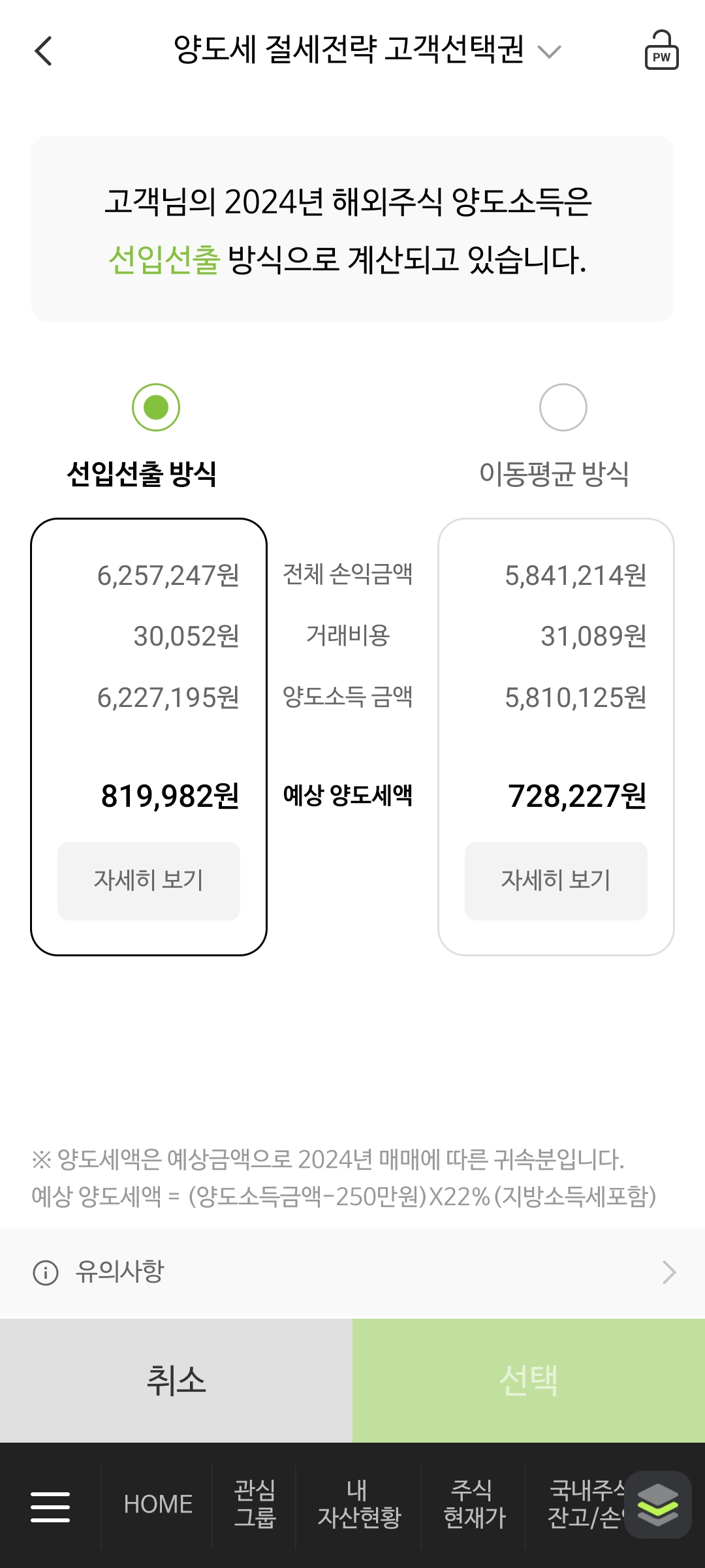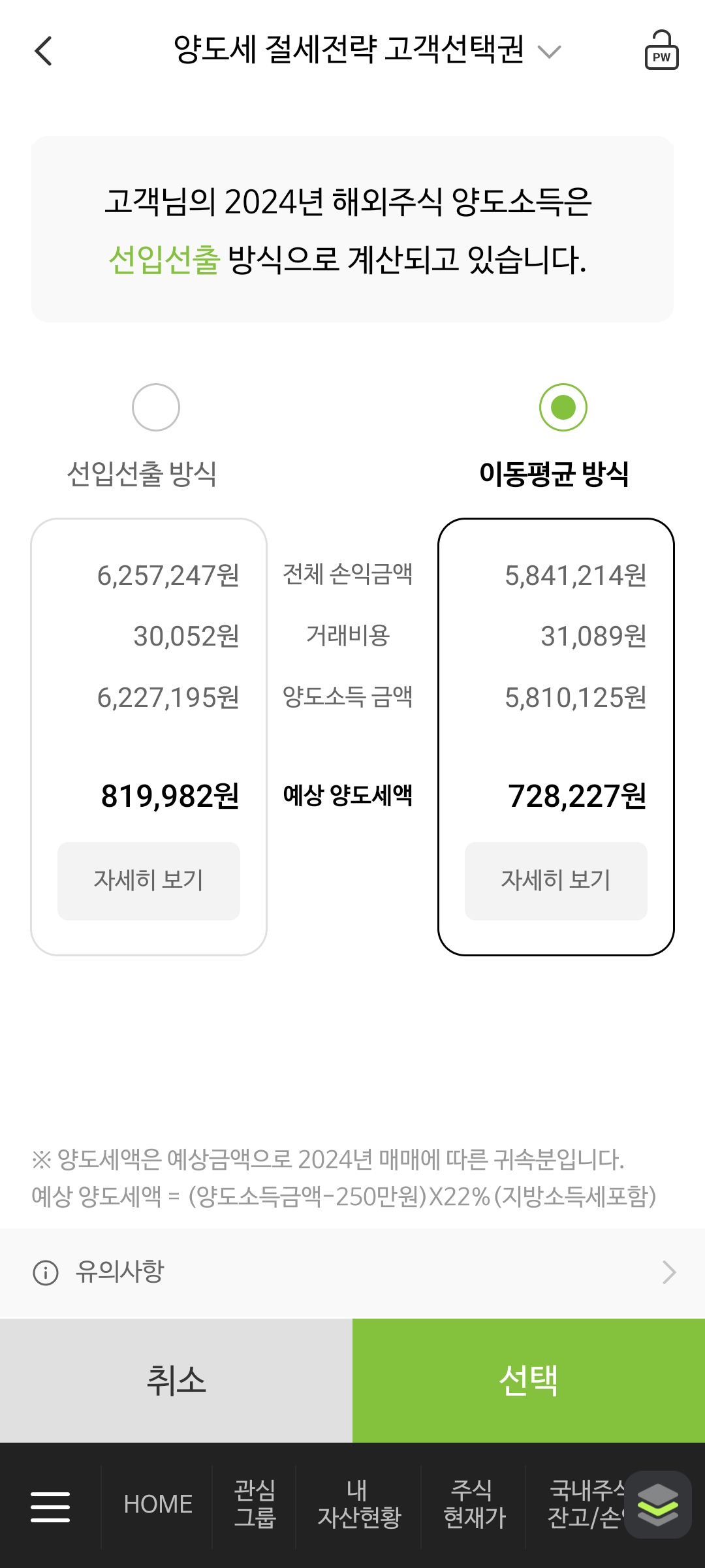 양도세 절세전략 고객선택권이라는 이름으로 NH투자증권에서는 2025년 양도소득세 신고(2024년 귀속분)부터 해외주식 양도소득세를 계산할 때 선입선출 또는 이동평균 둘 중 하나를 선택할 수 있도록 해두고 있다.
