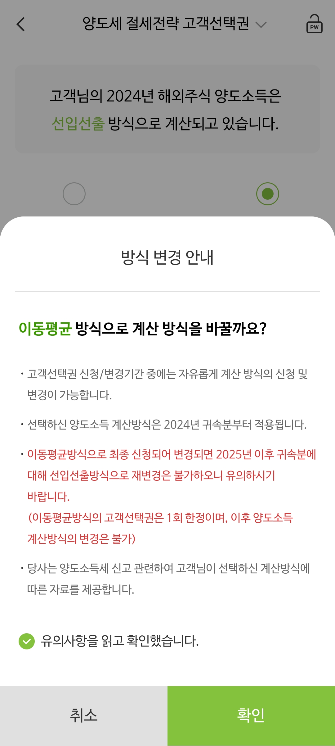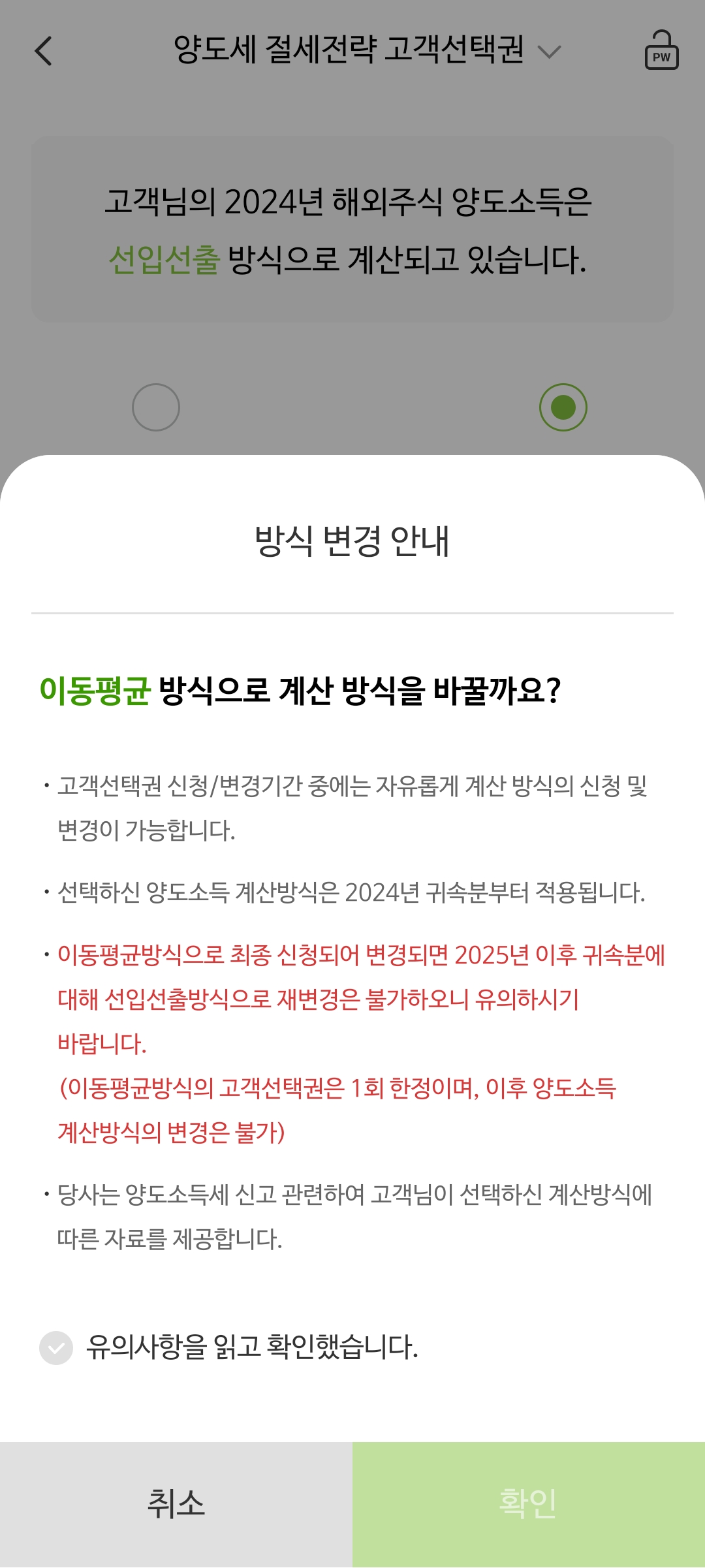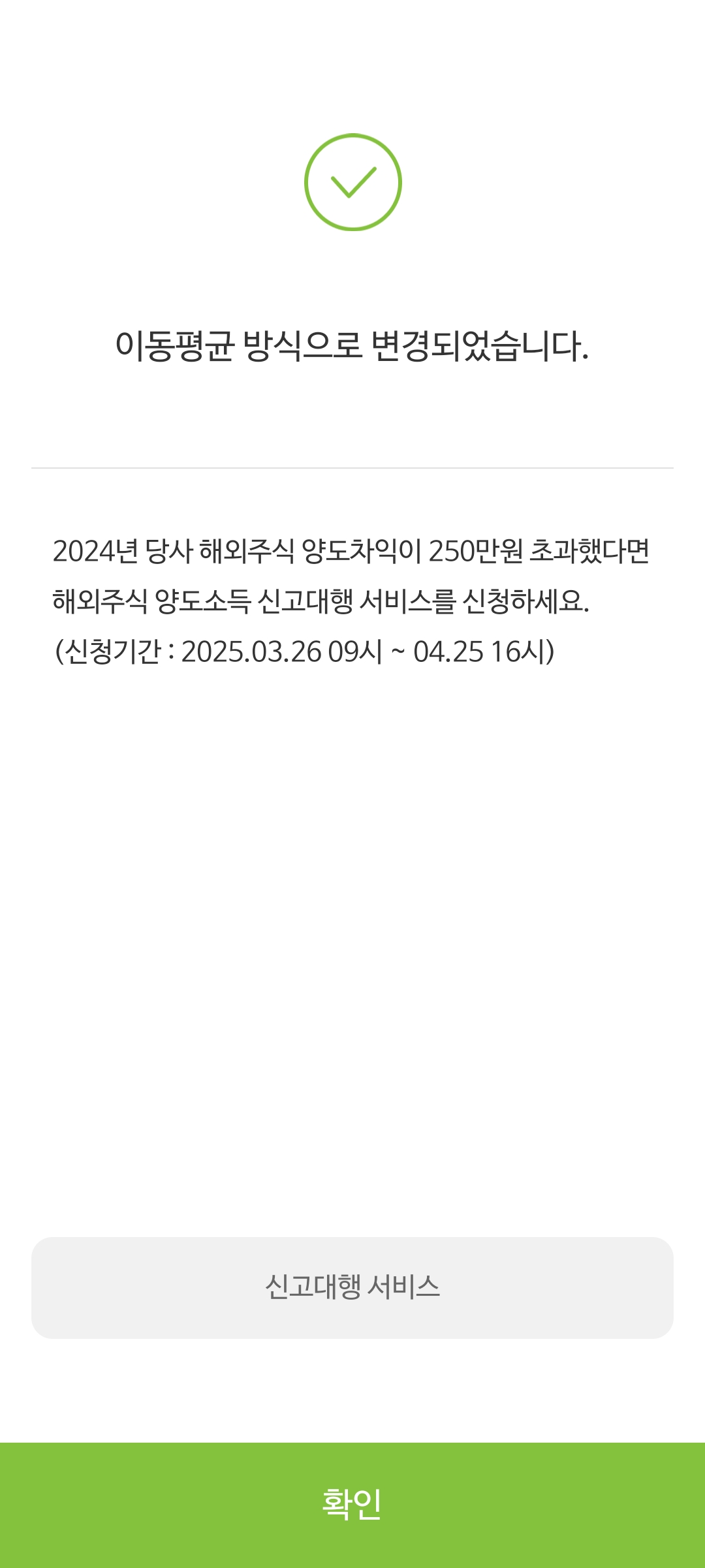2025년 4월이 되면서 해외주식 양도소득세 신고대행을 맡기려고 NH투자증권을 통해 일처리를 진행하고 있었는데 새롭게 출시된 기능으로 고객이 직접 선입선출 또는 이동평균 방식 둘 중 하나를 선택할 수 있는 서비스가 생겼다는걸 알게 됐다.