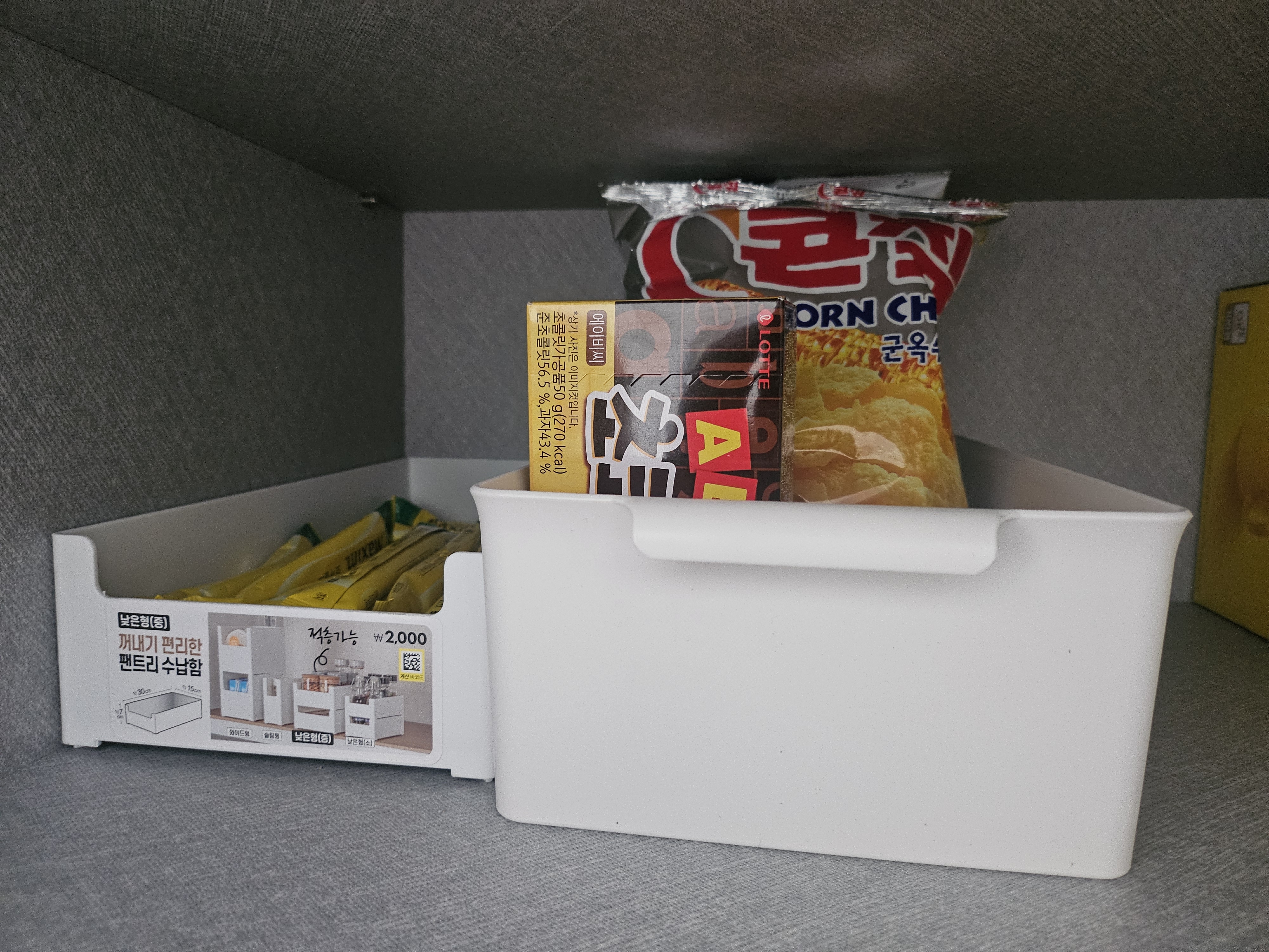 손잡이형 다용도 수납함이랑 팬트리수납함을 같이 배치해두어도 보기가 괜찮다. 다이소 팬트리 수납함은 스티커를 꽉 붙여놔가지고 떼기가 힘들어서 일단은 걍 붙어놓고 쓰고 있다...ㅋㅋ