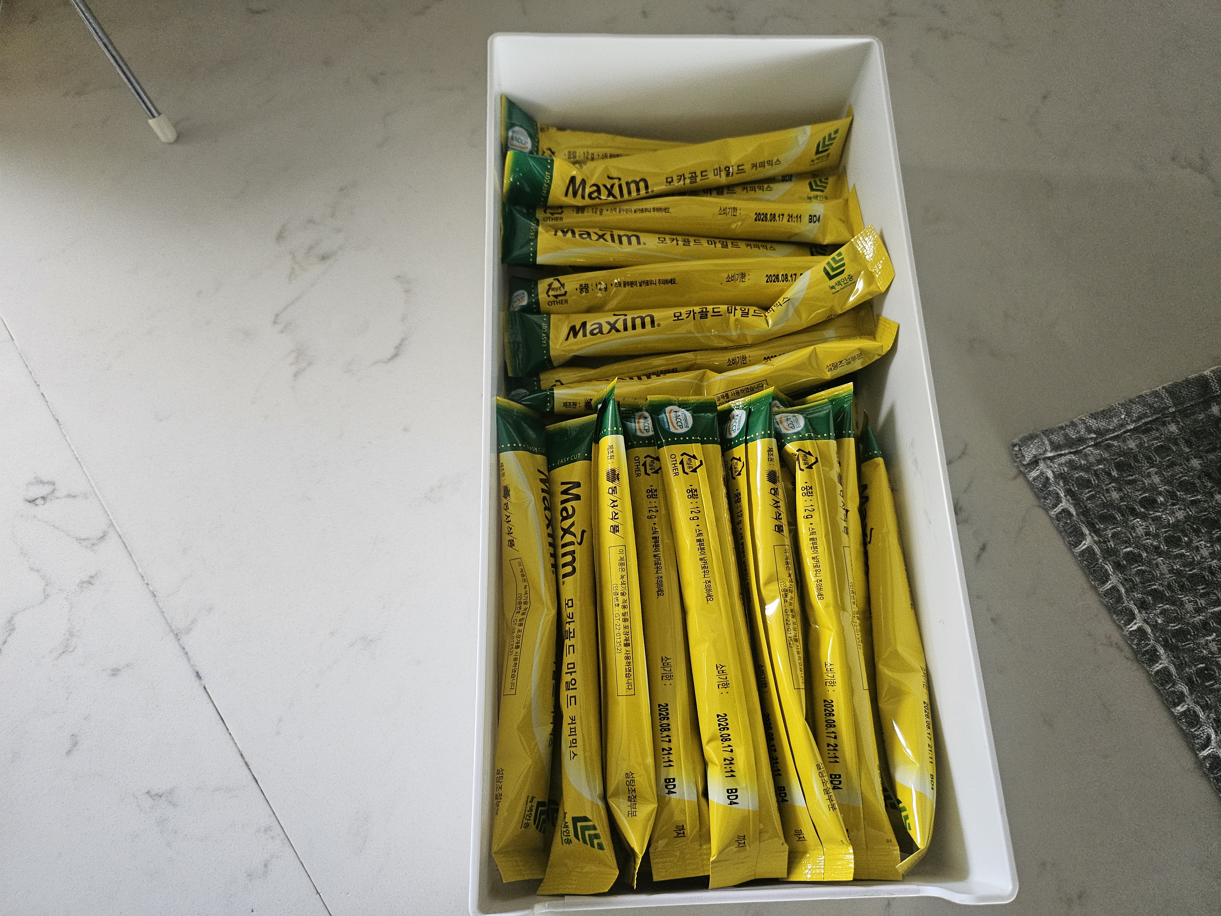 팬트리 수납함은 손잡이형 다용도 수납함보다 높이가 낮아서 마음에 들었는데 커피믹스 넣어두는 용도로 쓰려고 사보았다. 적절하게 잘 들어간다. 높이가 낮아서 엄청 많이 들어가진 않는다. 필요하다면 2칸, 3칸, 쌓아서 활용하면 될 듯 하다.