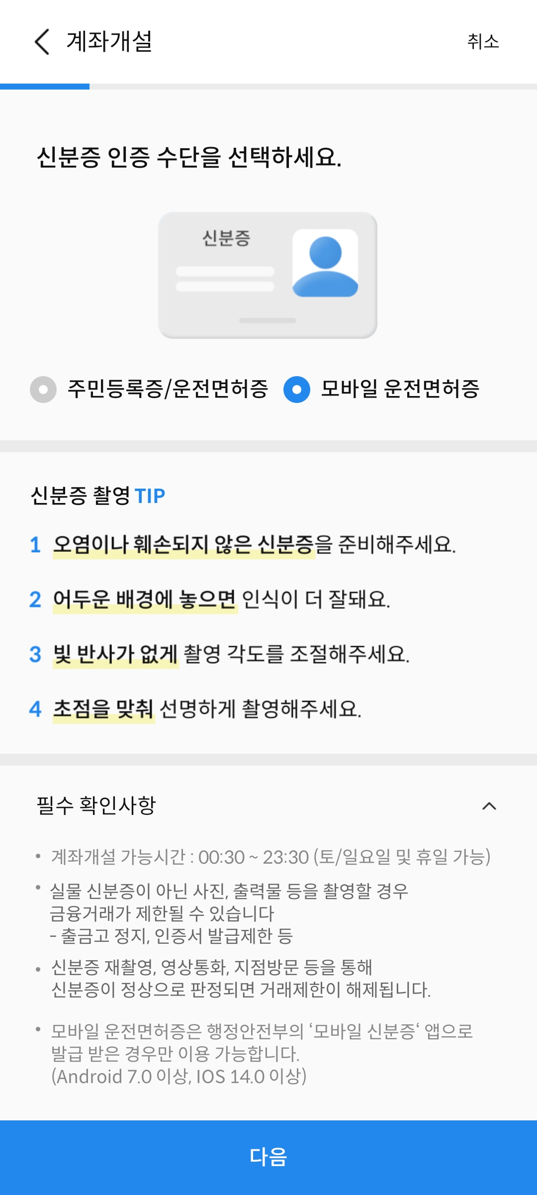 이어서 계좌개설을 진행한다. 본인확인서 사전 확인사항에 체크해주고, 계좌개설을 위해 신분증을 준비해서 촬영해준다. 이때 모바일 운전면허증을 이용하면 편리하게 이용할 수 있다. 한가지 이해가 안되는 부분은 모바일 운전면허증은 적용해주는 반면에 모바일 신분증(주민등록증)은 아직 시스템에 반영되지 않은건지 이용할 수 없다는점이다. 어차피 똑같은 행안부 '모바일 신분증'앱을 쓰는데 운전면허증은 되고 신분증은 왜 안되는지 이해 불가다.