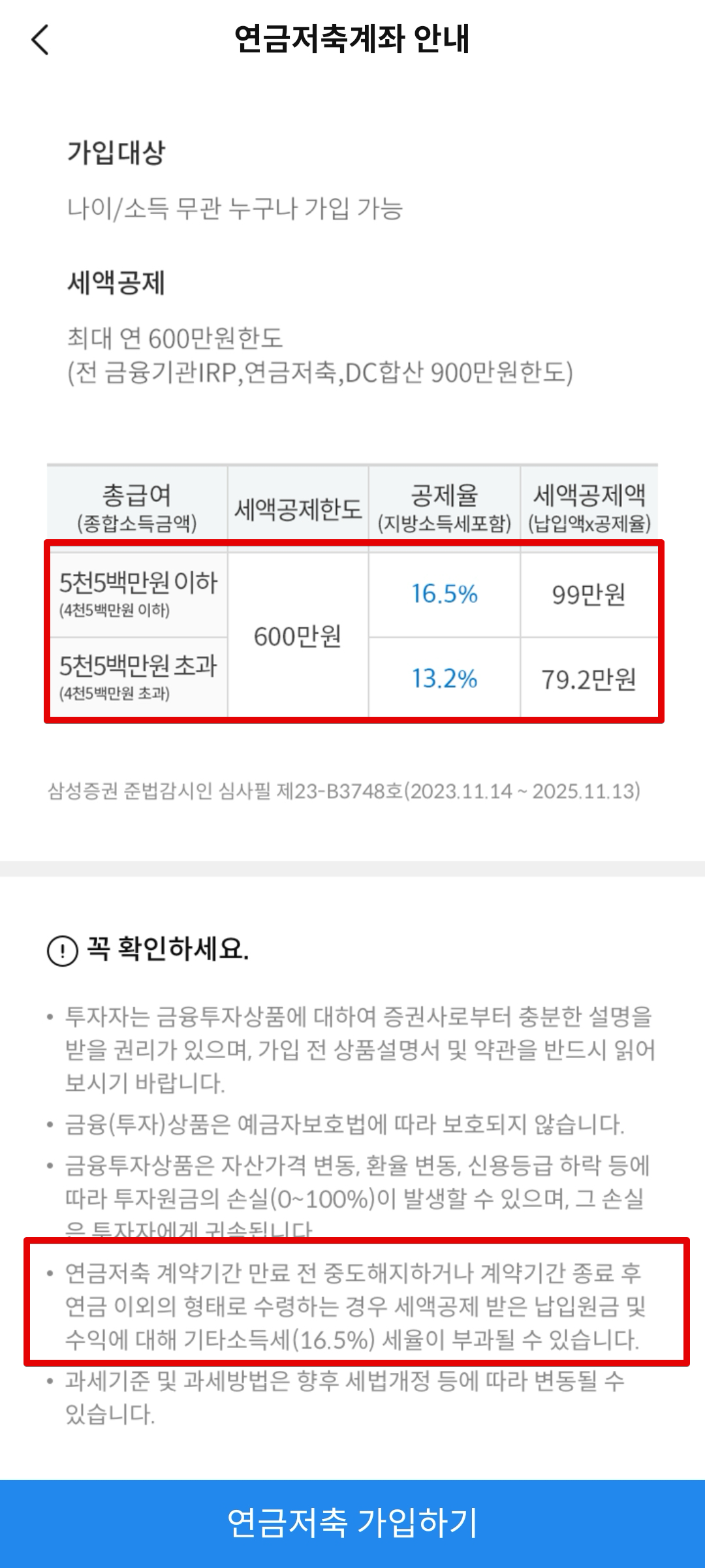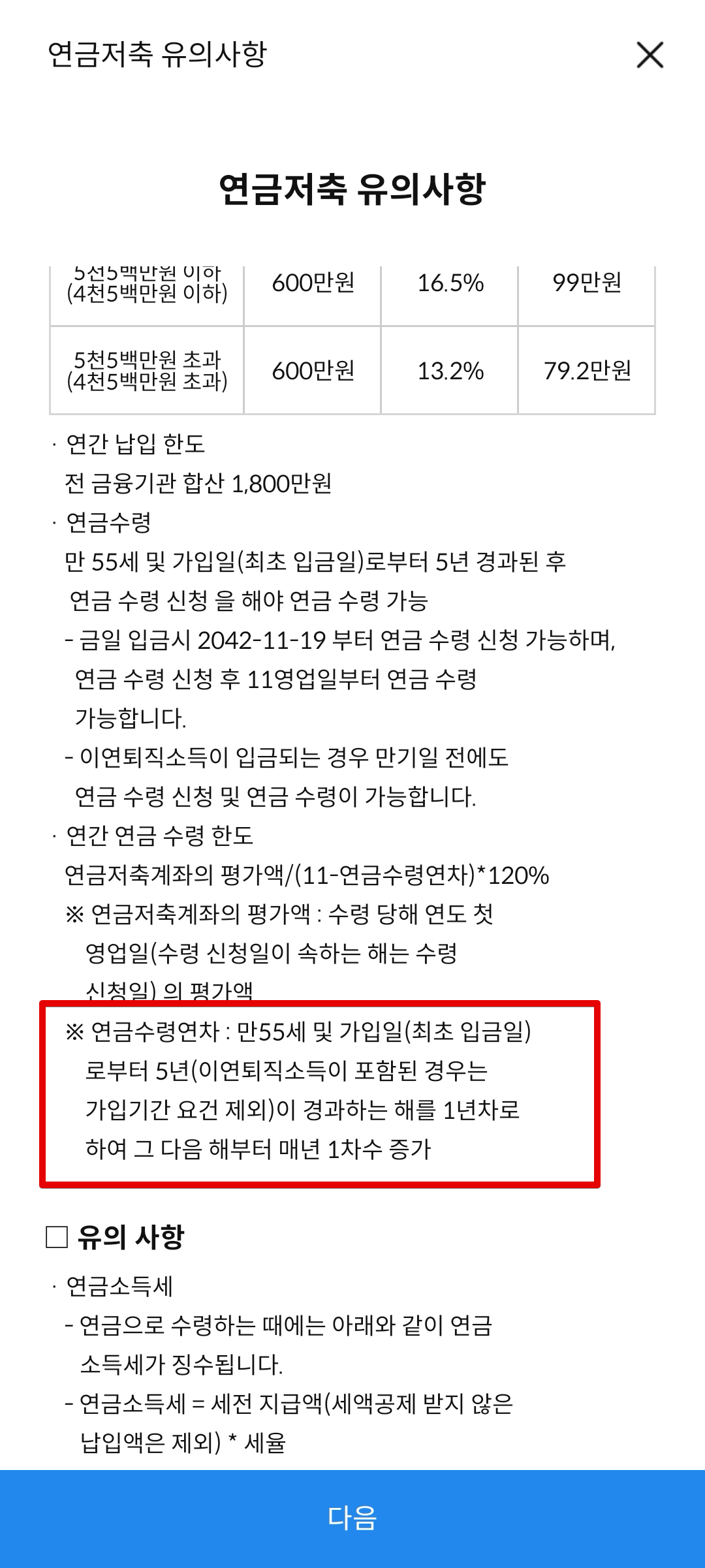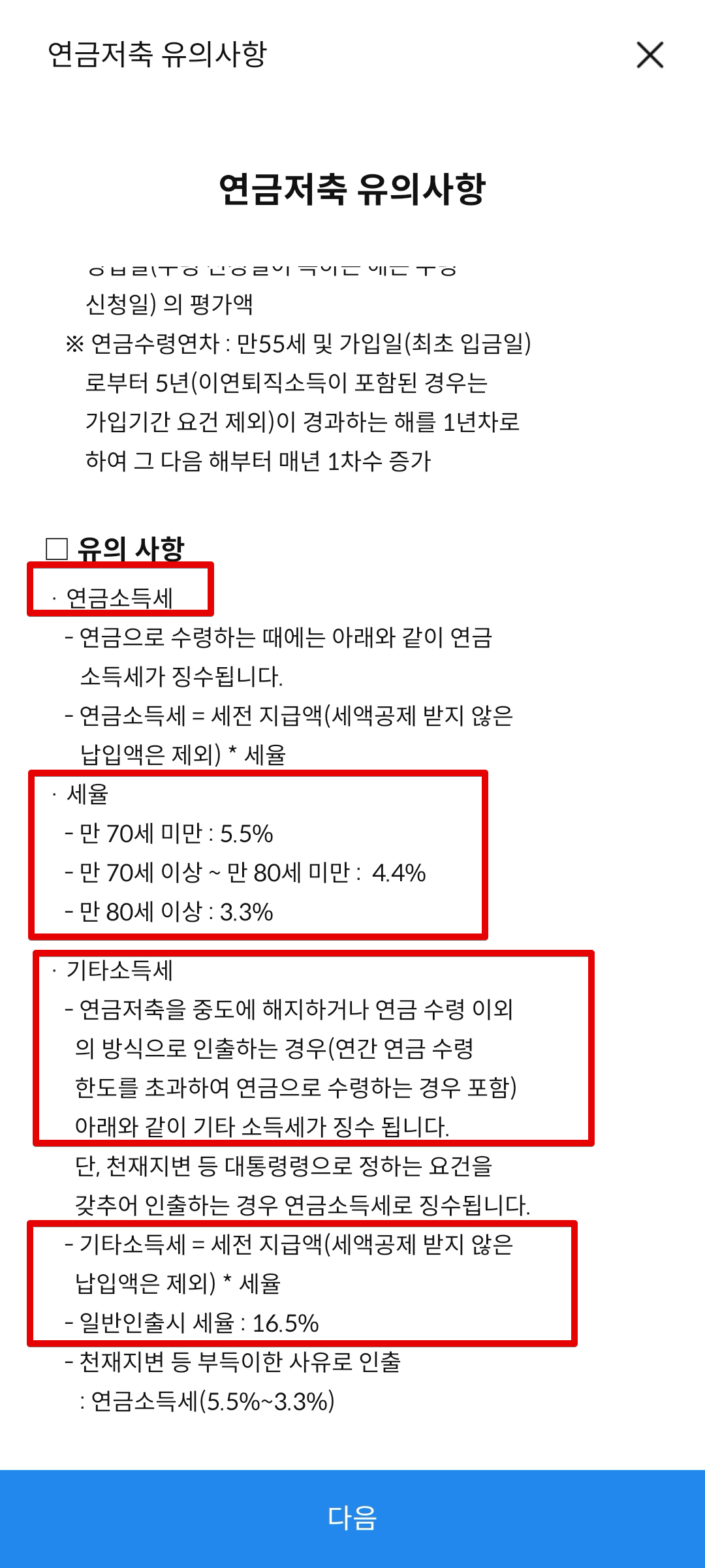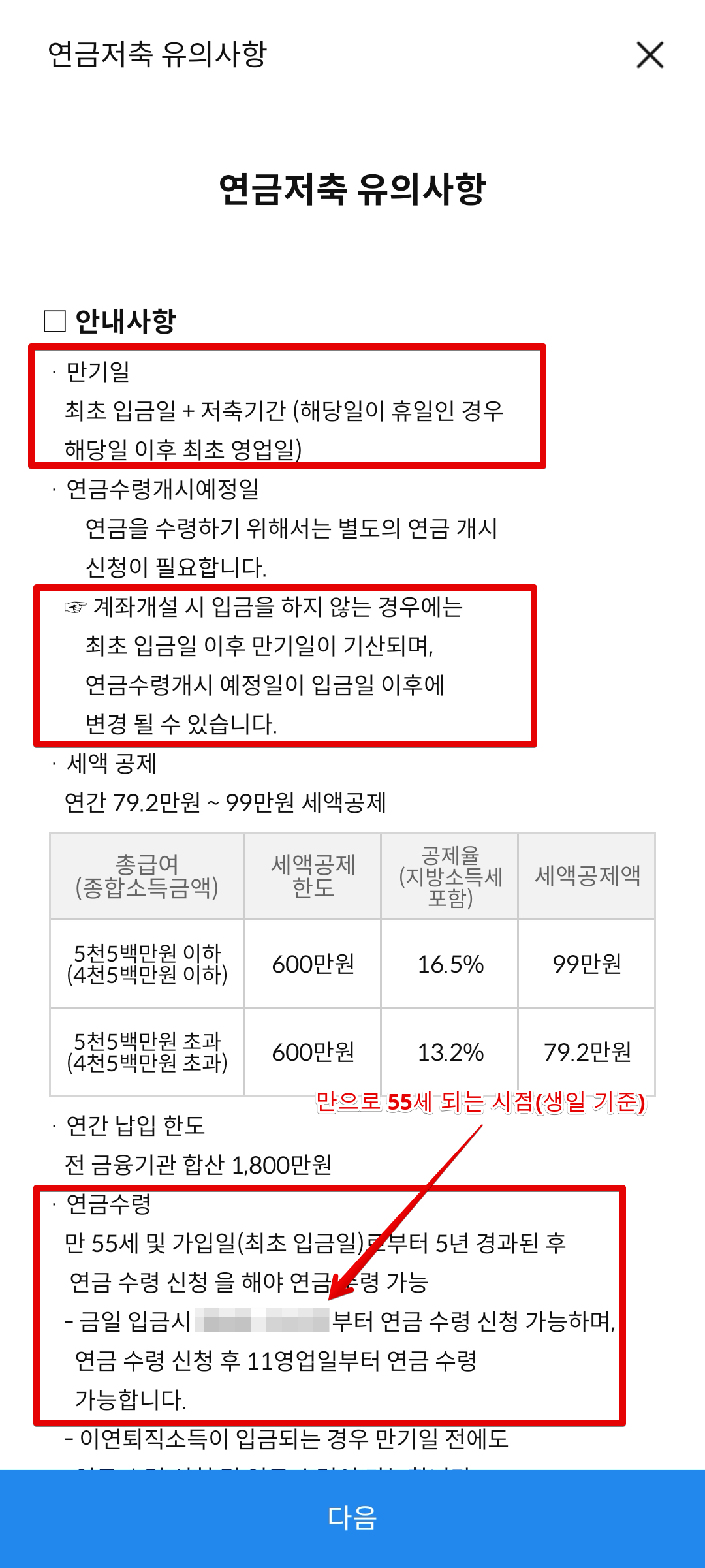 연금계좌의 경우 절세 계좌이므로 일반 계좌랑은 다르게 다소 까다로운 금융 이해도를 요구하고 있다. 따라서 연금저축계좌를 만들 땐 꼭 유의사항이나 확인사항을 읽어보도록 하자. 중요한 내용은 빨간색 상자로 표시하였다.