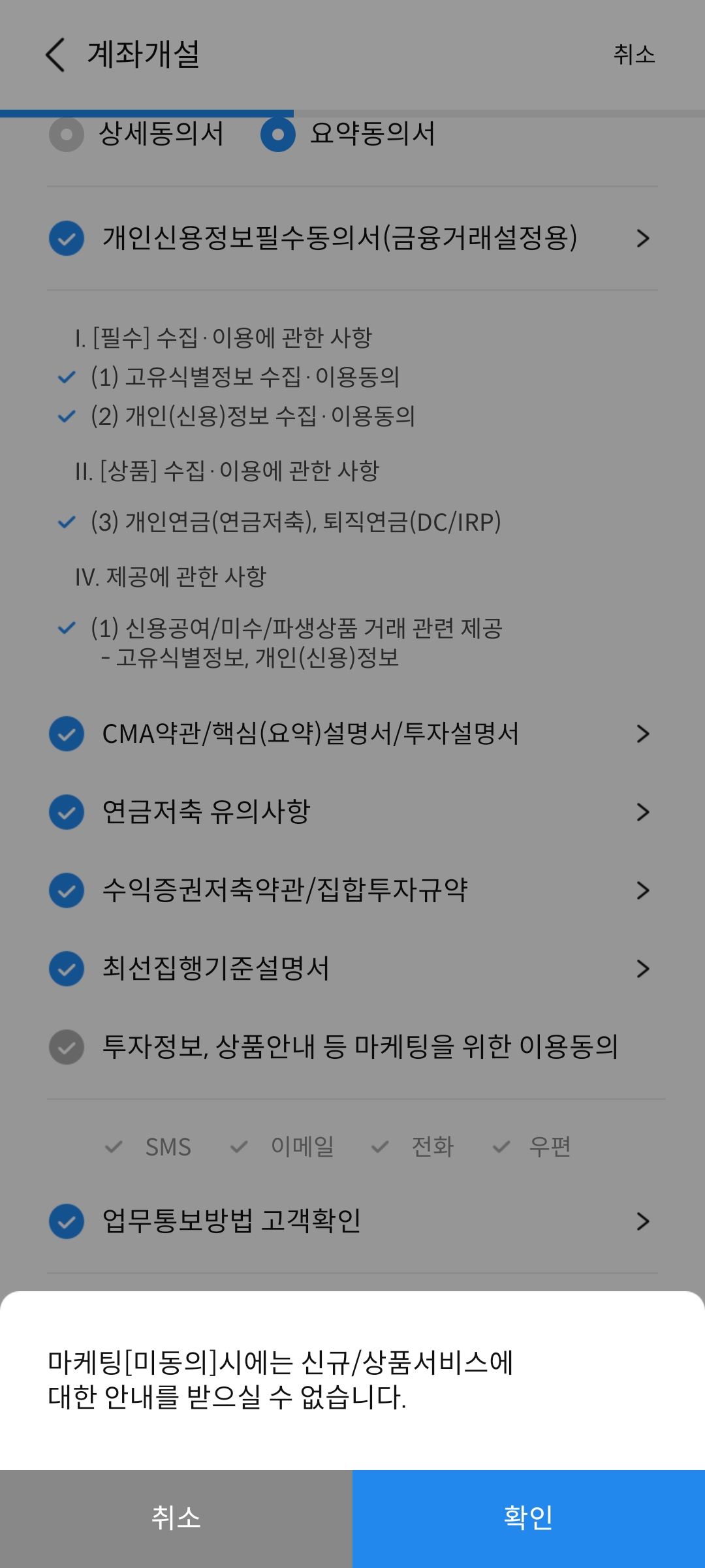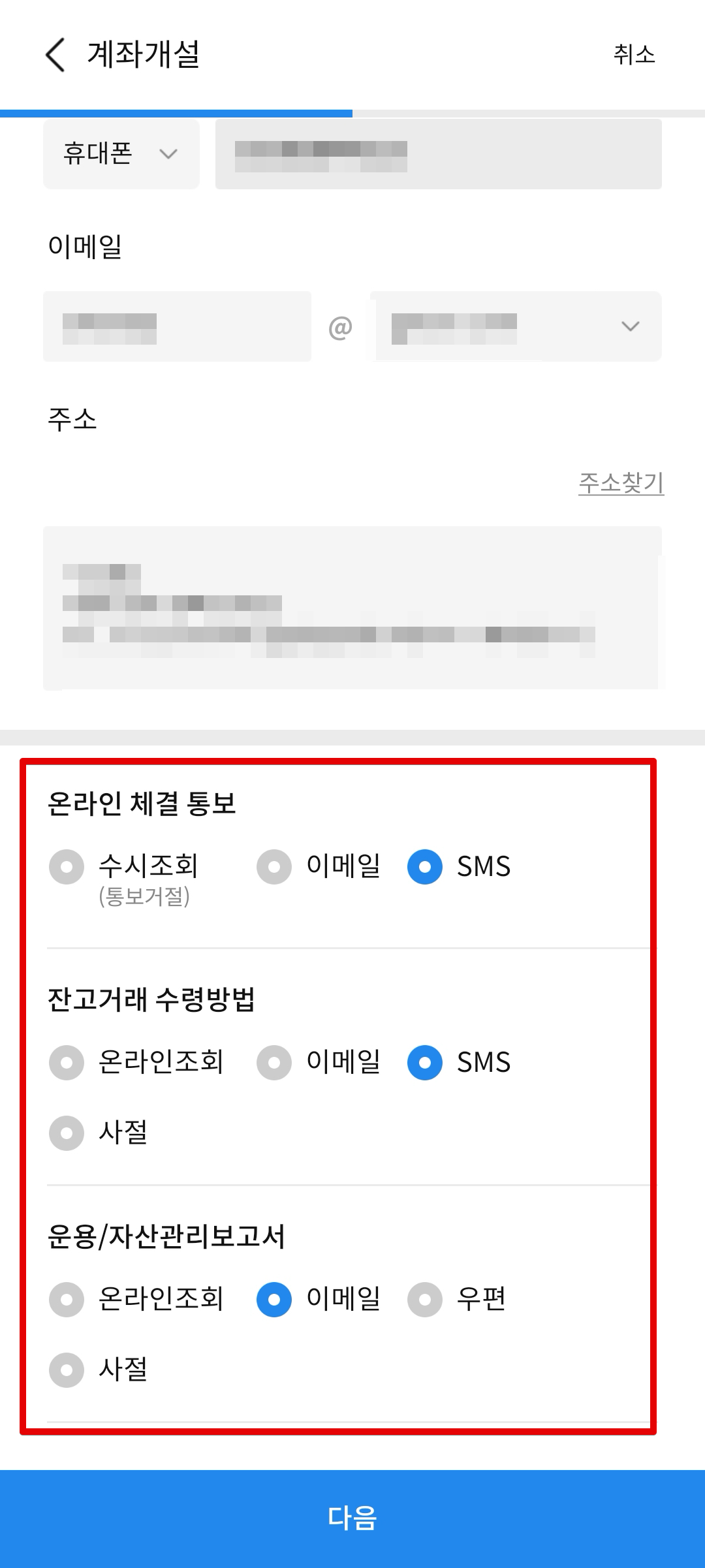 온라인 체결 통보는 SMS로 설정하고 잔고거래 수령방법도 SMS로 한다. 자산관리보고서는 컴퓨터에서 쉽게 확인하기 위해서 이메일로 설정한다.