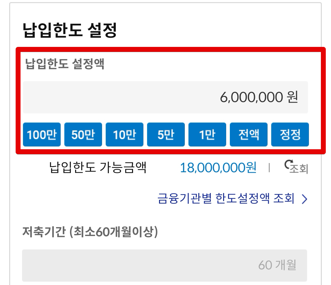납입한도는 1인당 전체 금융사를 통합해서 1800만원 한도내에서 설정할 수 있다. 이 글 제일 위에서 재테크 전략을 짤 때 한도를 함께 설정해두었으므로 해당 한도게 맞게 설정하면 된다.