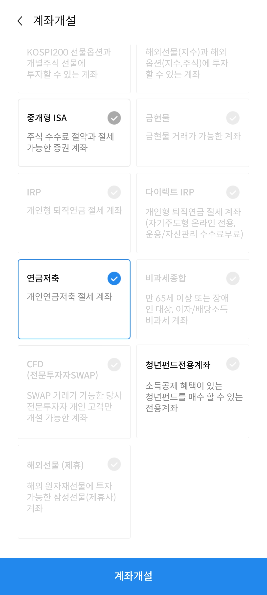 삼성증권 앱으로 진행한다. [계좌개설]로 들어가면 여러개의 계좌들이 보이는데 여기에서 [연금저축]을 클릭하고 [계좌개설]을 클릭한다.