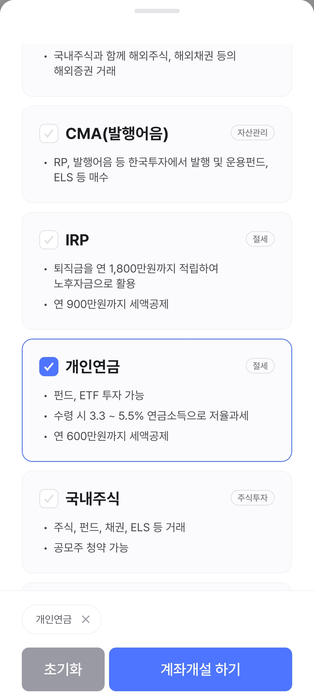 일단 한국투자증권 앱에서 시작한다. 계좌개설 메뉴에서 [개인연금]을 클릭한다. 그런데 이때 이미 IRP 계좌를 만들었기 때문에 오늘은 계좌개설이 안된다고하고 내일 다시 시도하라는 안내메시지가 나온다. 하지만 여기에서 포기하지 않고,