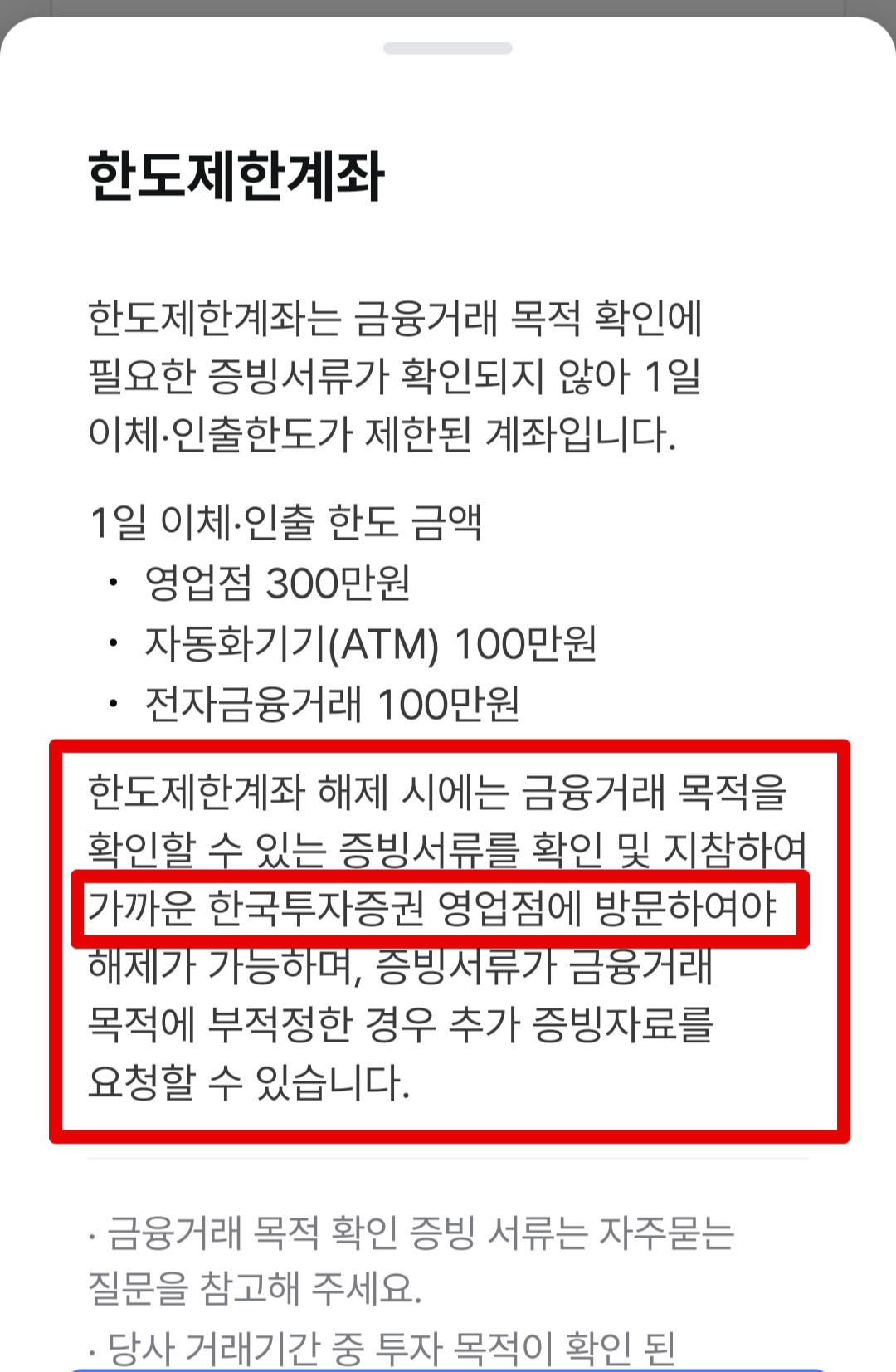 한국투자증권의 경우 한도제한계좌를 해제할 때 안내되기로는 무조건 영업점에 방문해서 증빙서류를 제출하라고 안내하고 있고 증빙서류가 무엇인지도 먼저 안내해주지 않을 정도로 소비자에게 다소 불친절하다는 인상을 받았다. 어떤 증빙서류인지도 알려주지 않고 증빙서류를 내라고 하는건 뭔가 좀 이상하긴하다.