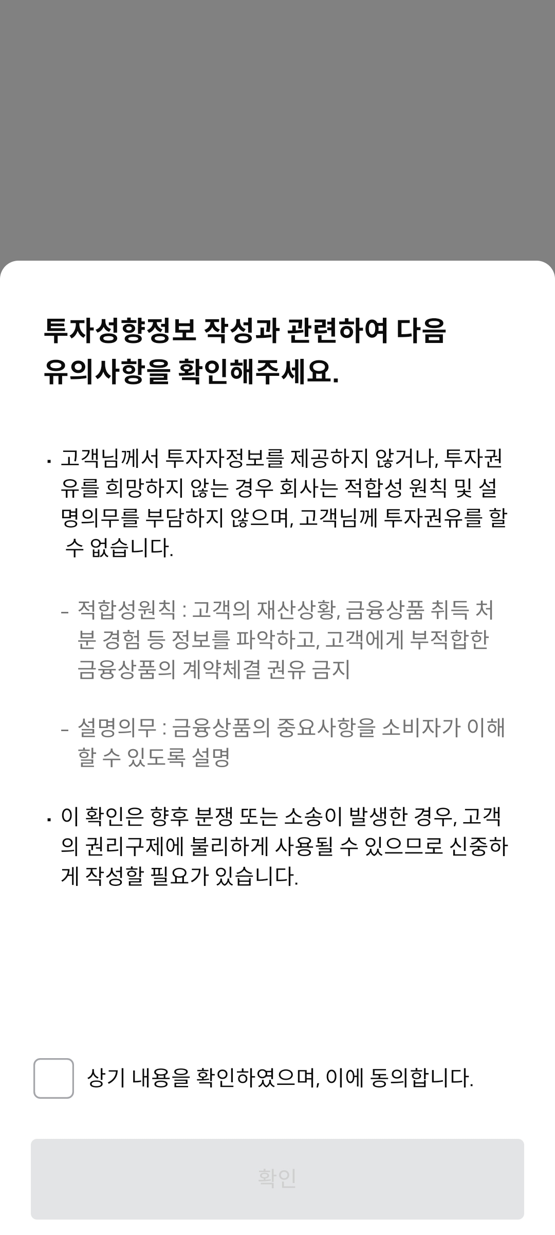 투자성향분석의 경우 위 이미지를 그대로 따라하기보다는 자신의 성향을 파악하기 위해 위 내용들을 잘 읽어보고 체크하도록 하자.