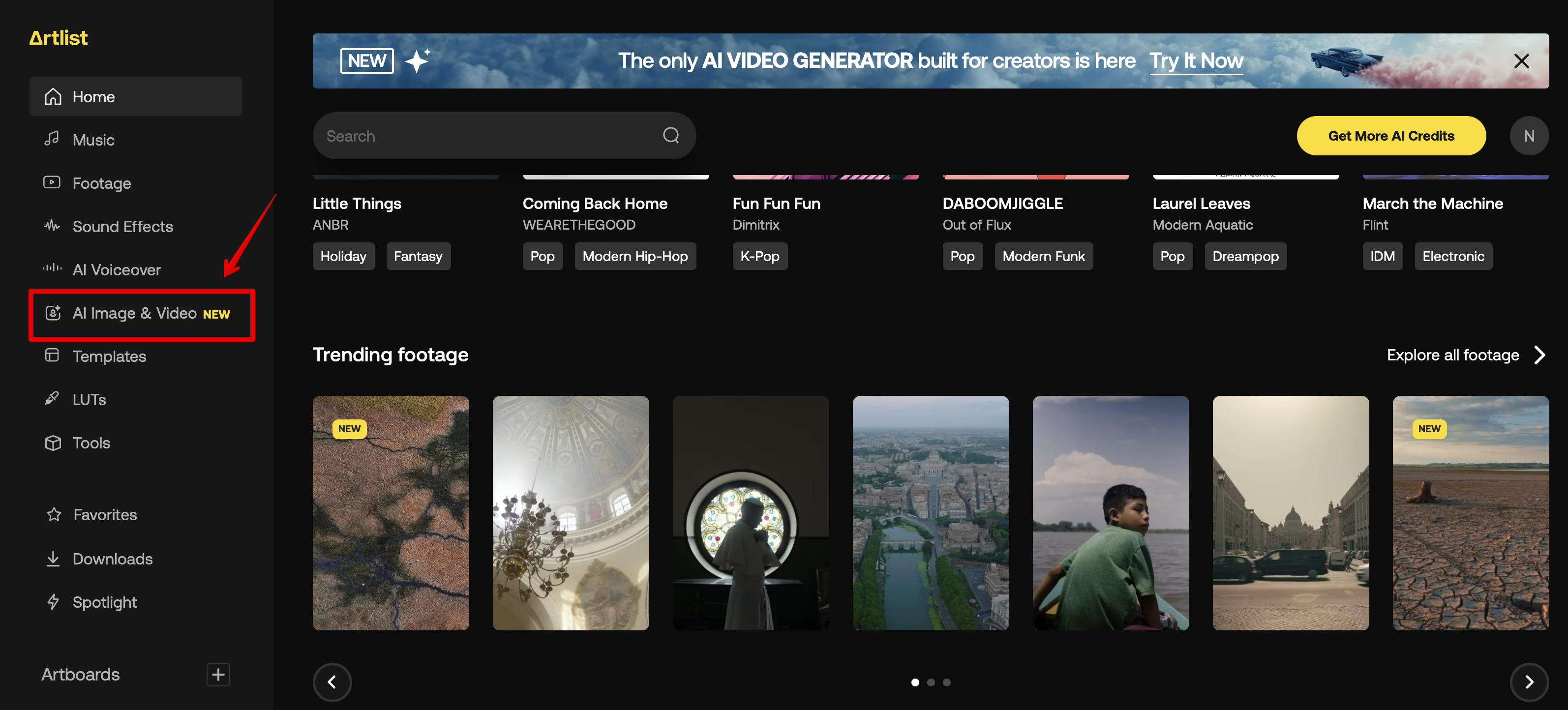아트리스트에 로그인한 후 왼쪽 메뉴에서 [AI Image & Video]를 클릭합니다.