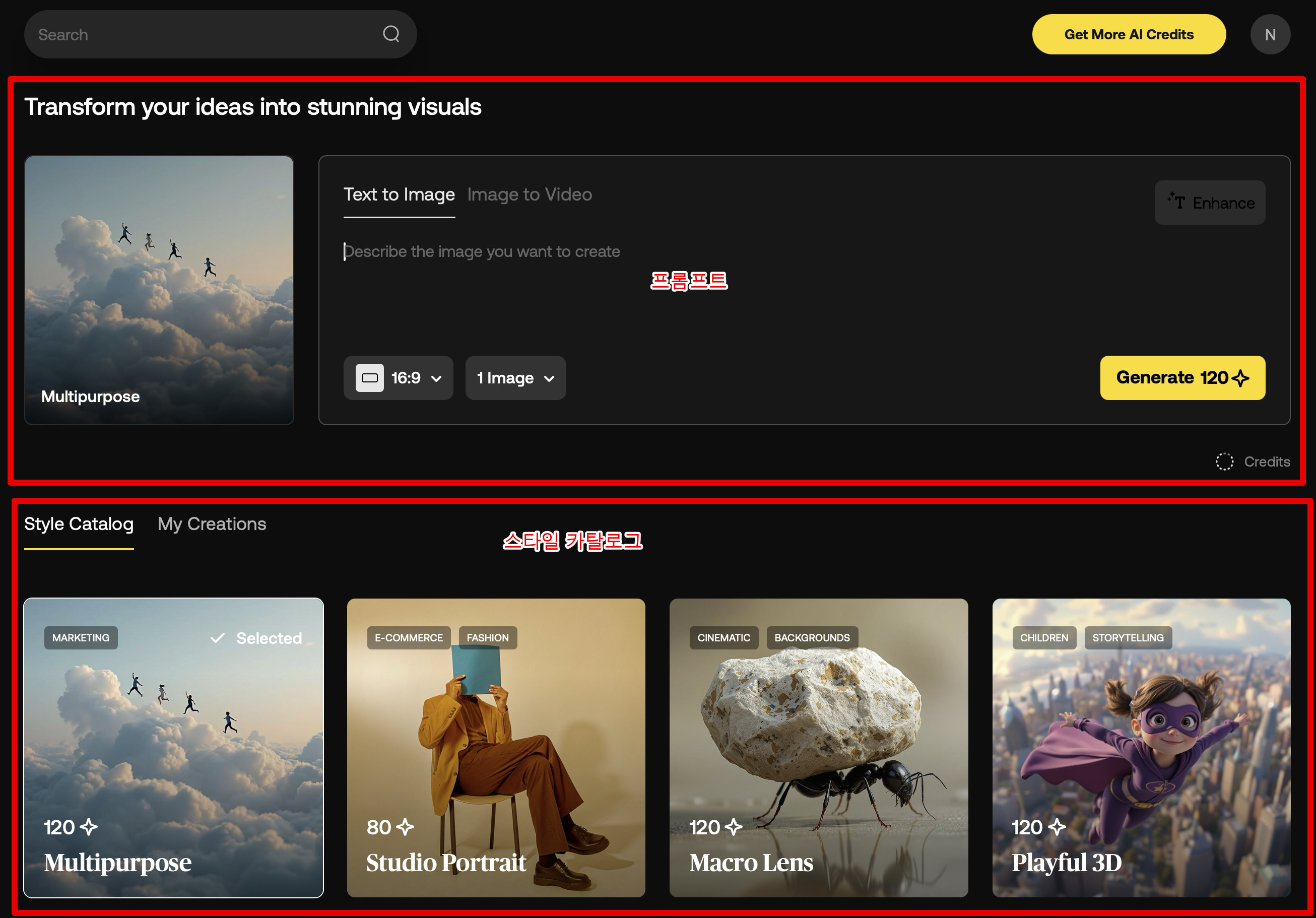 프롬프트를 입력했다면 우측 상단에 있는 [Enhance]버튼을 클릭해서 프롬프트를 더 나은 조건으로 변경해보세요. 자동으로 바꿔주며 더 나은 결과물을 기대할 수 있습니다.