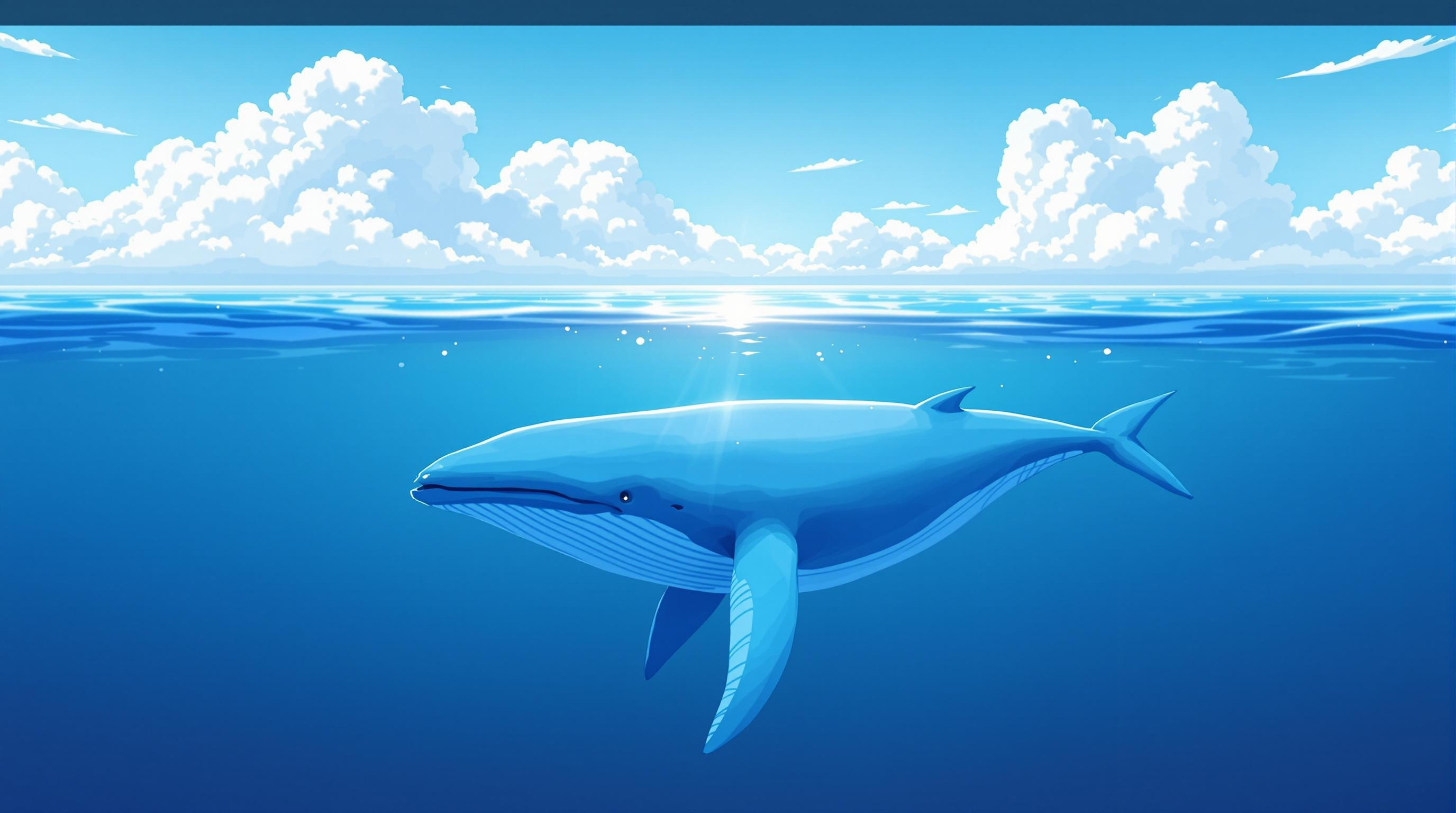 a majestic blue whale swimming in a calm, blue ocean under a bright sky with soft white clouds. digital art illustration. a single blue whale, side view, swimming peacefully in a serene blue ocean. soft, diffused light from a bright sky with hazy white clouds. calm water surface with a low horizon line. digital painting, illustration style. dreamlike illustration of a blue whale swimming in a tranquil blue sea beneath a pale sky with wispy white clouds. soft pastel colors, smooth gradients.