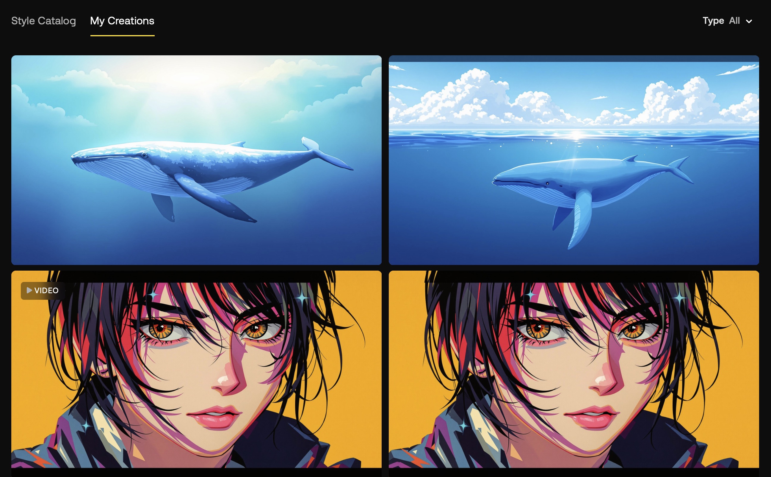 생성된 이미지와 동영상은 [My Creations] 메뉴에서 모두 볼 수 있고 다운로드 및 영상화를 할 수 있습니다.