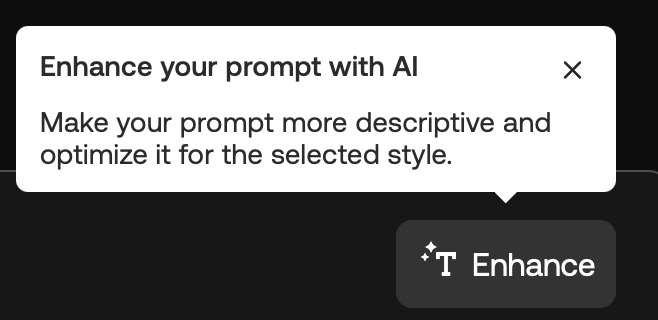 프롬프트를 입력했다면 우측 상단에 있는 [Enhance]버튼을 클릭해서 프롬프트를 더 나은 조건으로 변경해보세요. 자동으로 바꿔주며 더 나은 결과물을 기대할 수 있습니다.