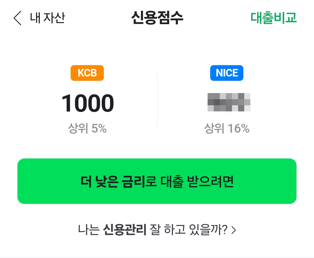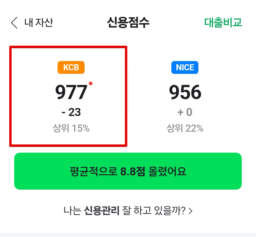나의 신용점수의 경우, 2개월 전만 하더라도 KCB 1000점 만점에 NICE쪽은 950점 이상이었다. 주택담보대출 상환 꼬박꼬박 잘하면서 유지하고 있었는데 이번에 아파트 갈아타기 하면서 대출 금액이 다시 늘어나게 되어서 KCB 점수가 977점으로 내려왔다. 그런데 950점 이상이라면 사실 만점이랑 큰 차이 없는 것 같긴 하다. 주택담보대출을 가진 상태에서 대출상환 꼬박꼬박하면서 신용점수 올릴 수 있고, 무엇보다 뭔가 큰 목돈이 들어가는 상황에서 주택을 보유하고 있는게 내 경험상 훨씬 더 유리하다. 예를들어 자동차를 살 때에도 내 경험상 아파트 소유를 증명하면 여러가지로 이익이 있다.