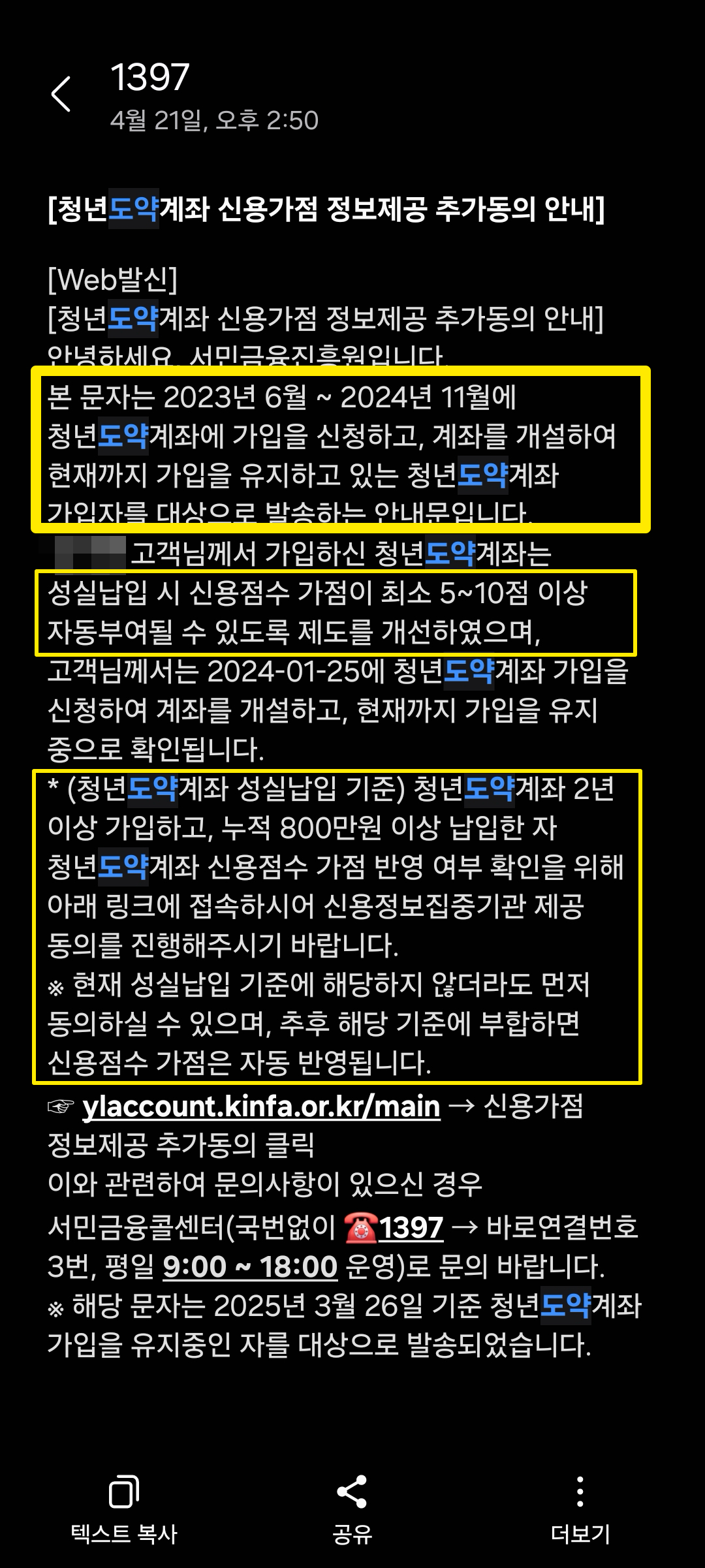 청년도약계좌에 2023년 6월부터 2024년 11월까지 가입하신분들 중에서 지금까지 계좌를 유지 중인 분들이라면 청년도약계좌 가입자를 대상으로 하는 위와 같은 안내 문자를 받으셨을 것이다. 해당 문자는 스팸처럼 표시돼 있지만 사실은 스팸아니고 찐이다. 도메인 주소가 or.kr이니까. 내용이 좀 복잡하게 설명돼 있는데 요약하면 다음과 같다.