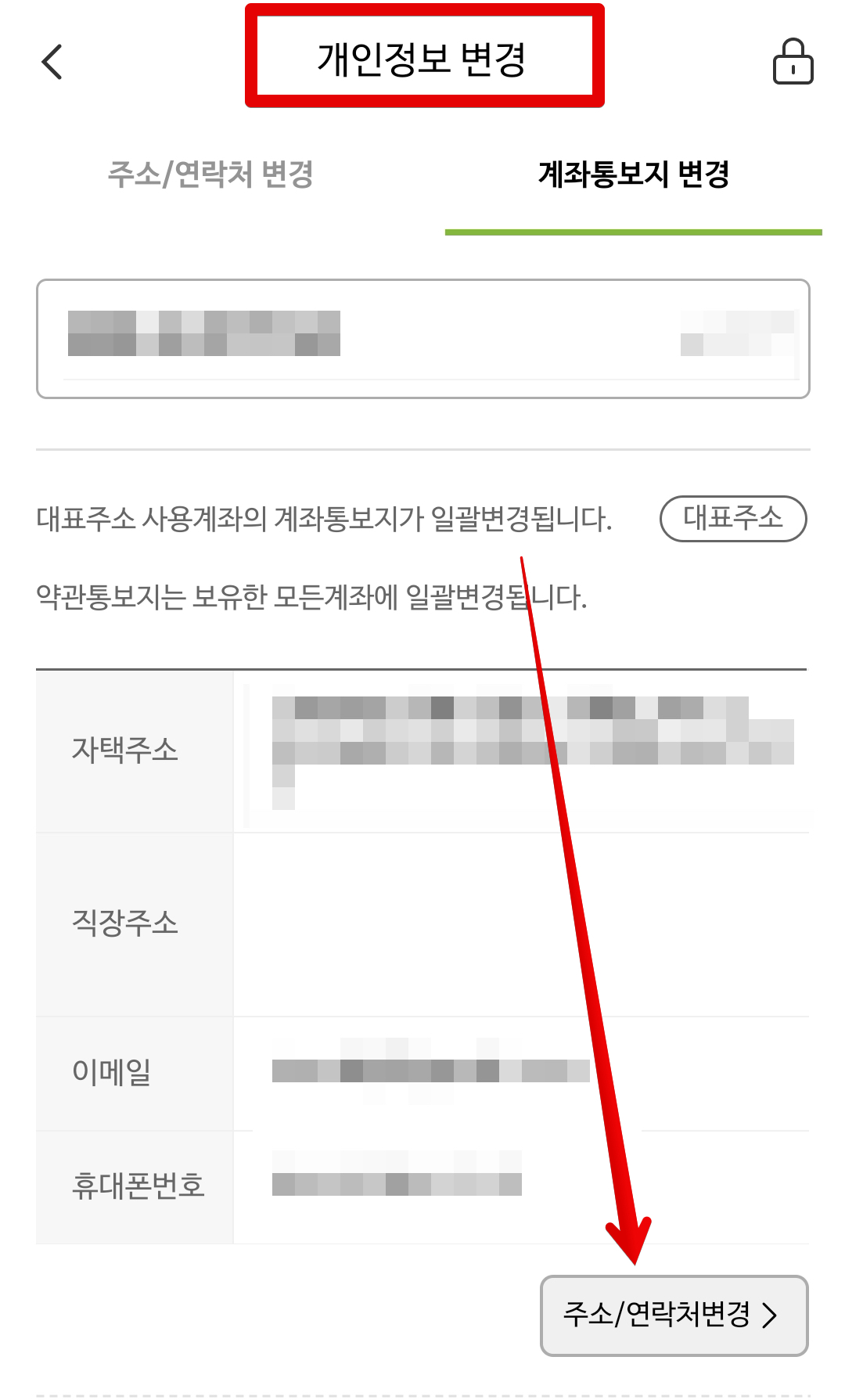 NH나무 증권은 [개인정보 변경] 메뉴에서 주소 및 연락처를 변경할 수 있다. 이사한 주소로 변경해준다.