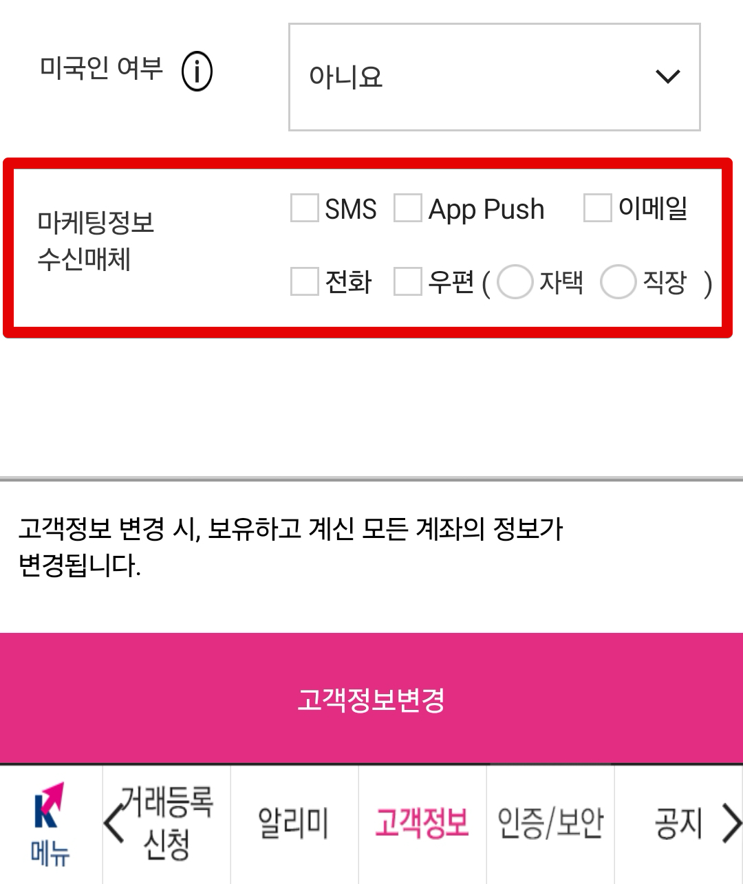 이때 화면 아래쪽에 마케팅 수신매체 및 동의 칸이 있으므로 확인하고 넘어가면 된다.