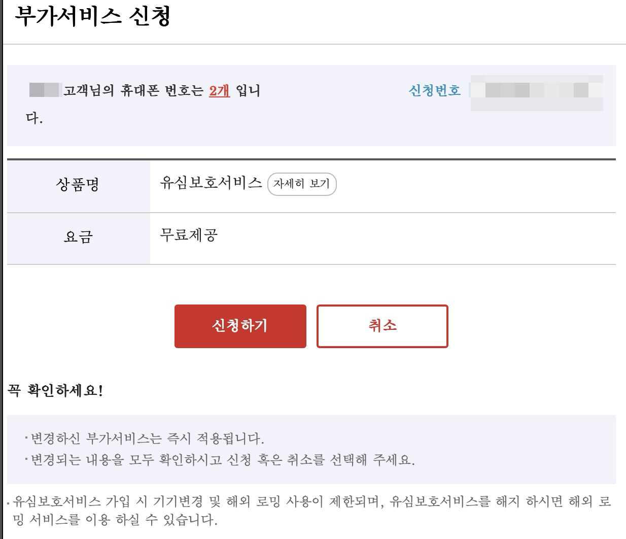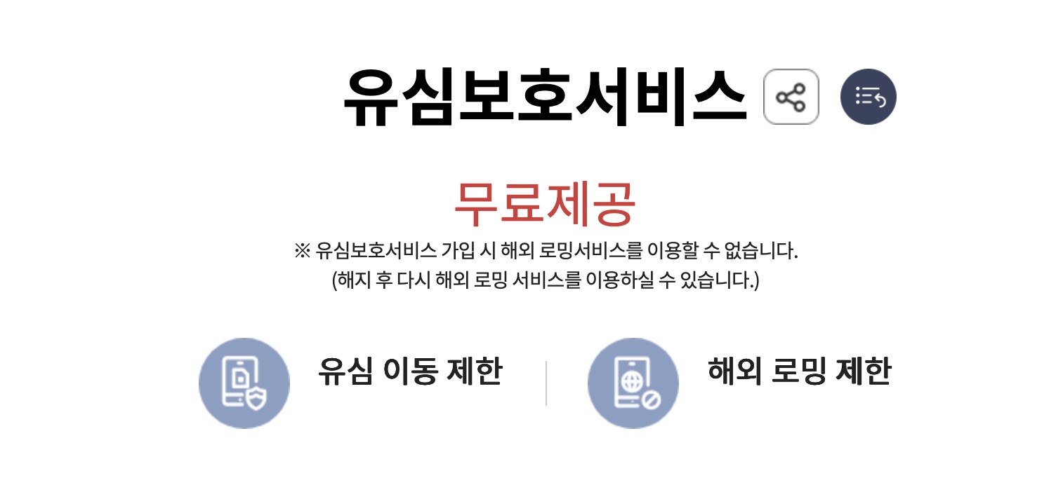 KT 유심보호서비스는 무료로 제공해준다. 다만 유심보호서비스에 가입하게 되면 해외 로밍서비스를 이용못하고 차단된다. 유심 이동 자체를 막아버리는 효과가 있는 듯 하고 궁금해서 찾아보니까 유심과 단말기 고유번호(IMEI)를 묶어버리는 형식이라고 하는 것 같다. 아무튼 유심보호서비스에 가입할 경우 로밍 차단 서비스에 자동으로 가입되는 시스템이다.
