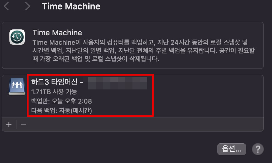 이후 새로운 하드를 받아서 교체 후 시놀로지 나스에서 새롭게 맥북 타임머신으로 연결해주었다. 사실 나는 타임머신을 그냥 보험용으로만 백업해두고 있고 뭔가 안심(?)되는 느낌을 받고 싶을 뿐... 실제로 타임머신으로 뭔가를 백업해본적은 거의 없긴 한데, 이게 며칠동안 안해보니까 또 은근히 신경 계속 쓰이고 계속 생각나고... 그래서 다시 타임머신 백업 연결을 해주었다.