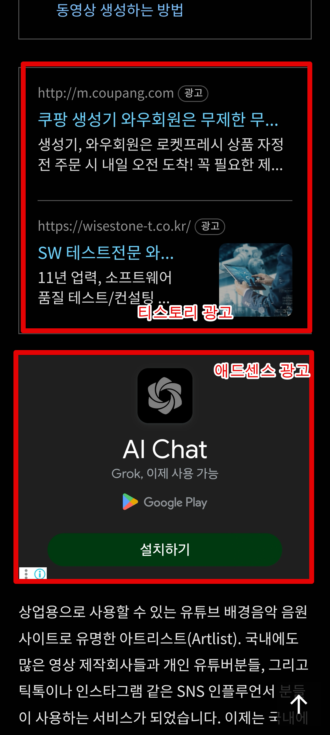 최근 티스토리에 강제로 붙은 광고들을 보면 주로 페이지 상단에 배치되는 경우가 많다. 가끔 광고가 안나타나는 경우도 있지만 대체로는 중간이나 하단보다는 상단에 배치를 강제로 시키는 모습을 볼 수 있다. PC 페이지에서는 그래도 사정이 좀 나은편인데, 모바일 화면에서는 위 이미지처럼 구글 애드센스 광고 상단 배치를 했을 경우, 페이지의 절반 이상이 접속하자마자 광고로 배치되어버리는 불상사가 일어나고 있다.