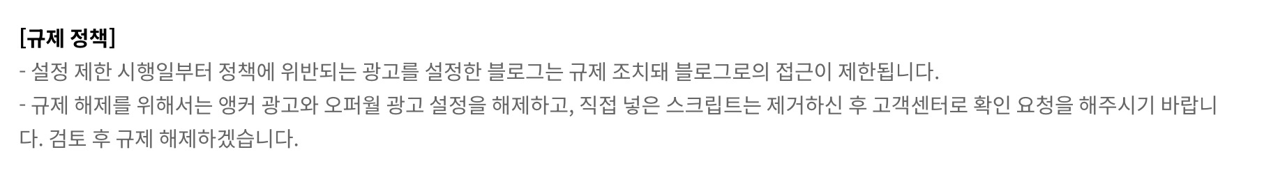 규제 정책 약관에 따라서 정책 위반 광고를 설정한 블로그는 규제 조치가 될 수 있다. 접근 제한이 되게되면 블로그 전체가 접근이 안되기 때문에 블로그를 일시적으로 이용할 수 없고, 내가 알기로는 관리자 페이지도 못들어가는걸로 알고 있어서 미리 설정해주는게 좋다.