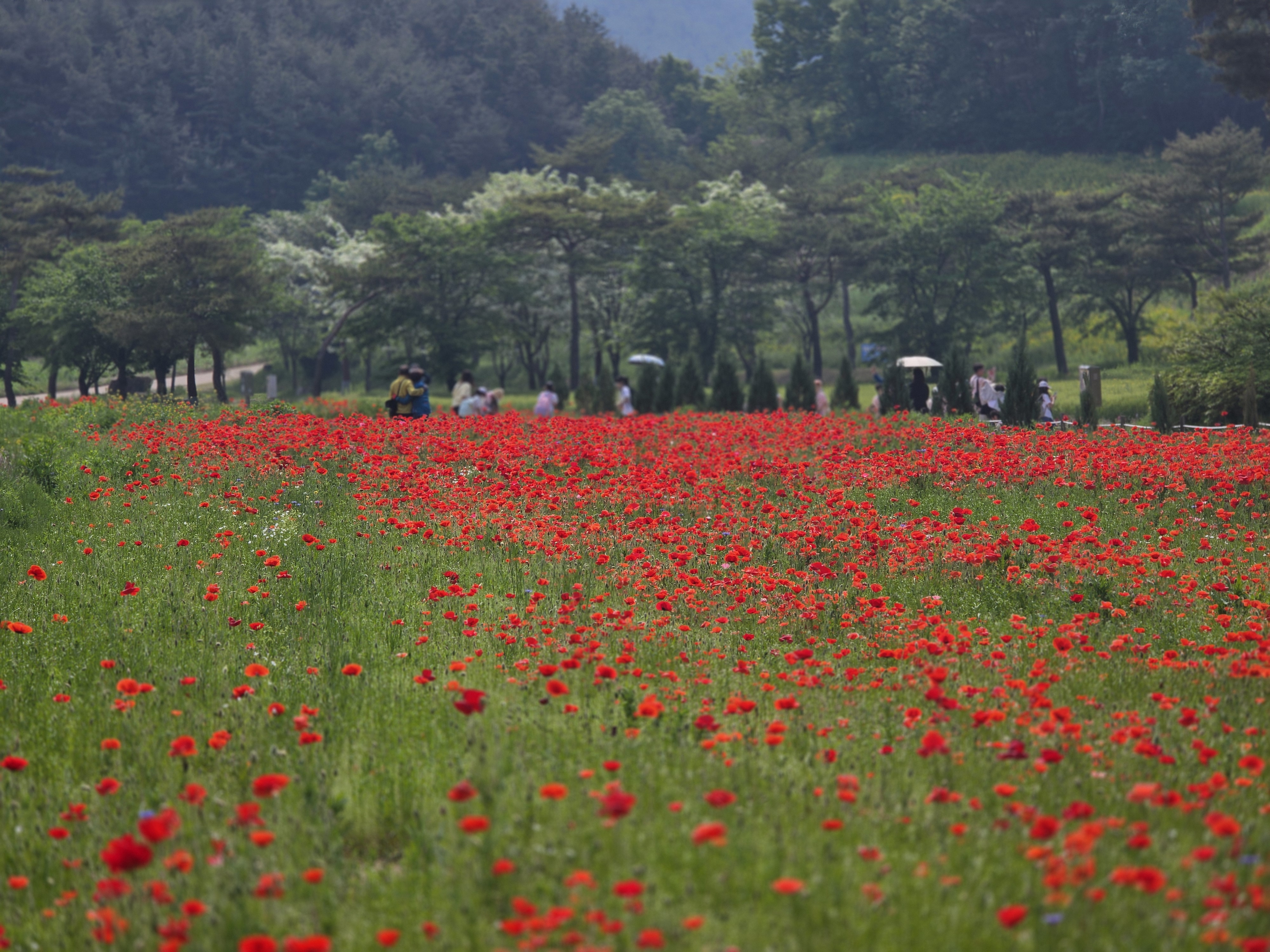 5월의 예천 회룡포마을에서 가장 인기있는 포인트인 양귀비 정원도 만나보았습니다. 끝없이 펼쳐진 붉은 양귀비꽃의 물결은 그야말로 장관이었는데요. 강렬하면서도 매혹적인 붉은색 꽃잎들을 보러 많은 관람객분들이 오셨더라고요. 푸른 하늘과 잘 어울리는 붉은 양귀비 꽃밭에서 잠시 감상해보았어요. 카메라 셔터를 누르며 아름다운 풍경들은 사진으로 담아보았습니다.