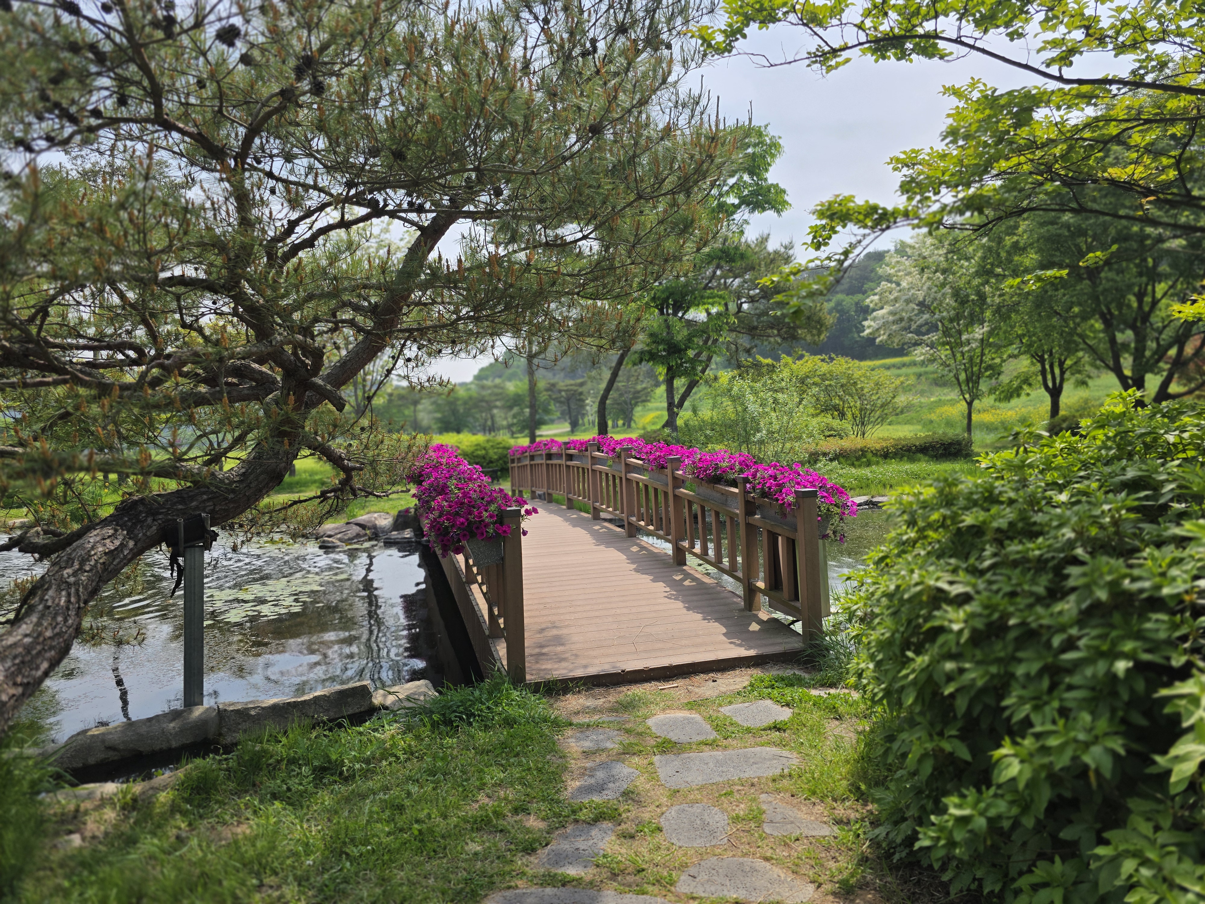제1주차장에서 회룡포마을로 가려면 뿅뿅다리를 건너서 가면 됩니다. 가는 길에도 나무들이 무척 예쁘고 향기롭게 식재돼 있어서 참 아름다웠어요.