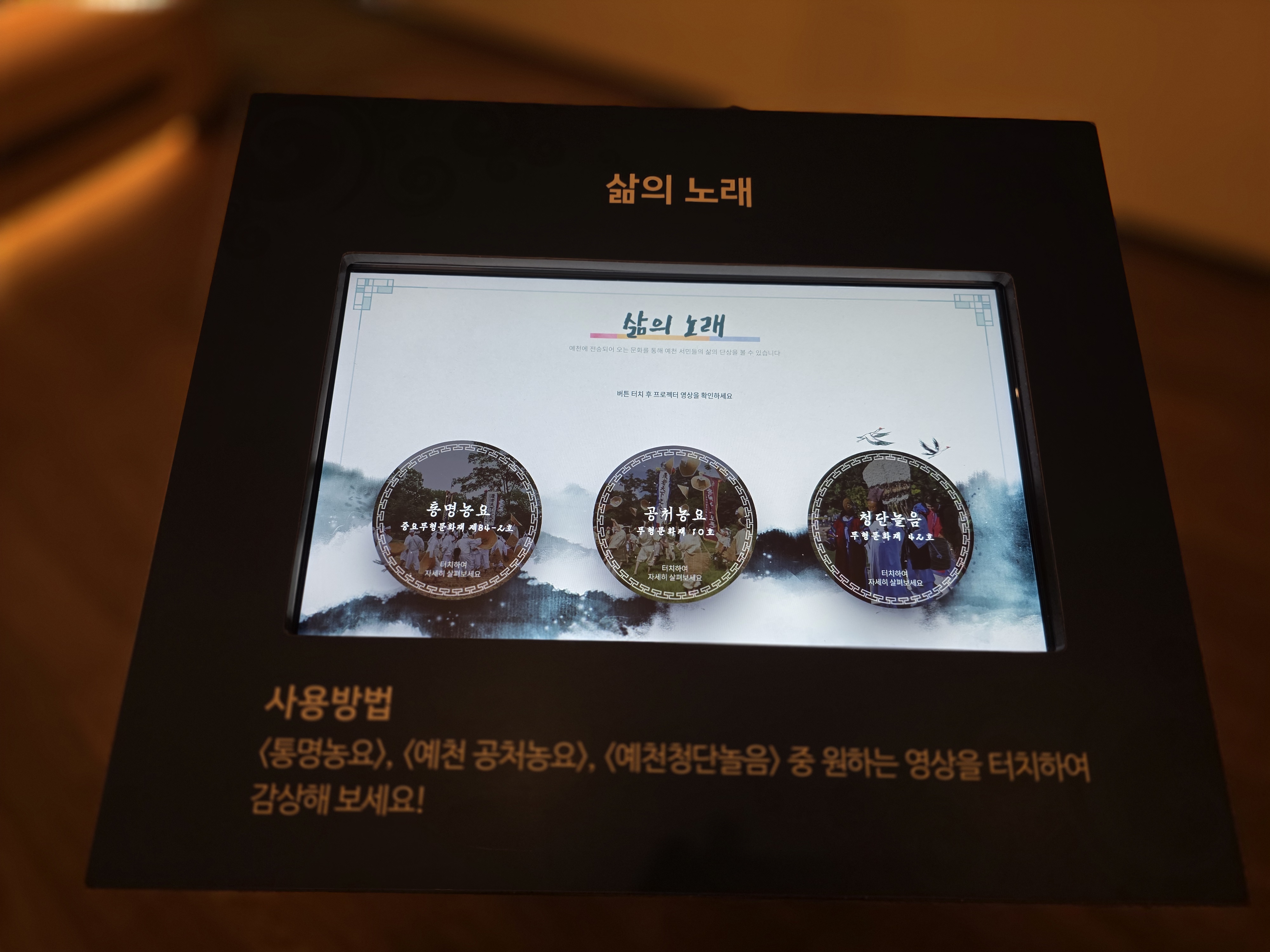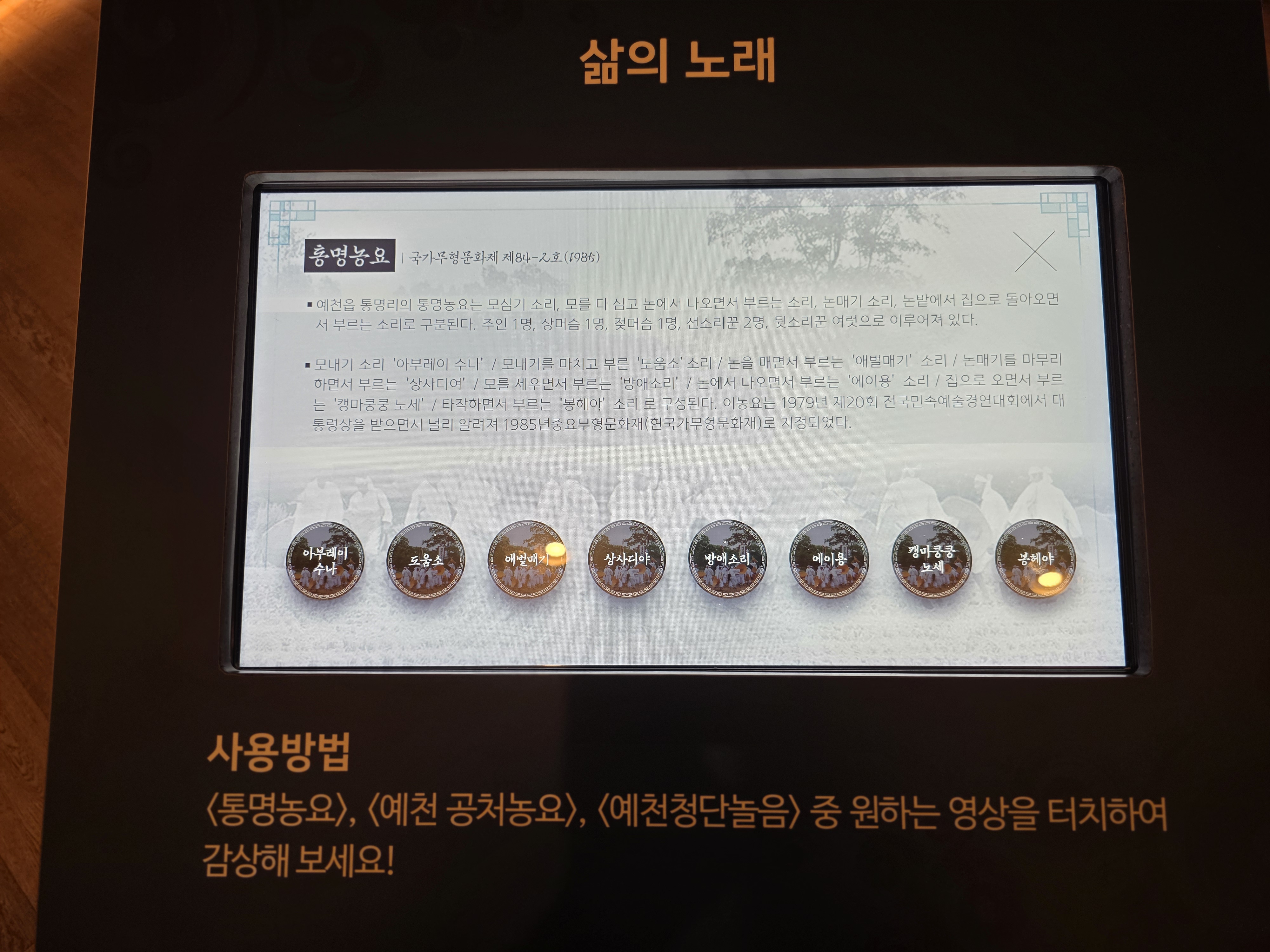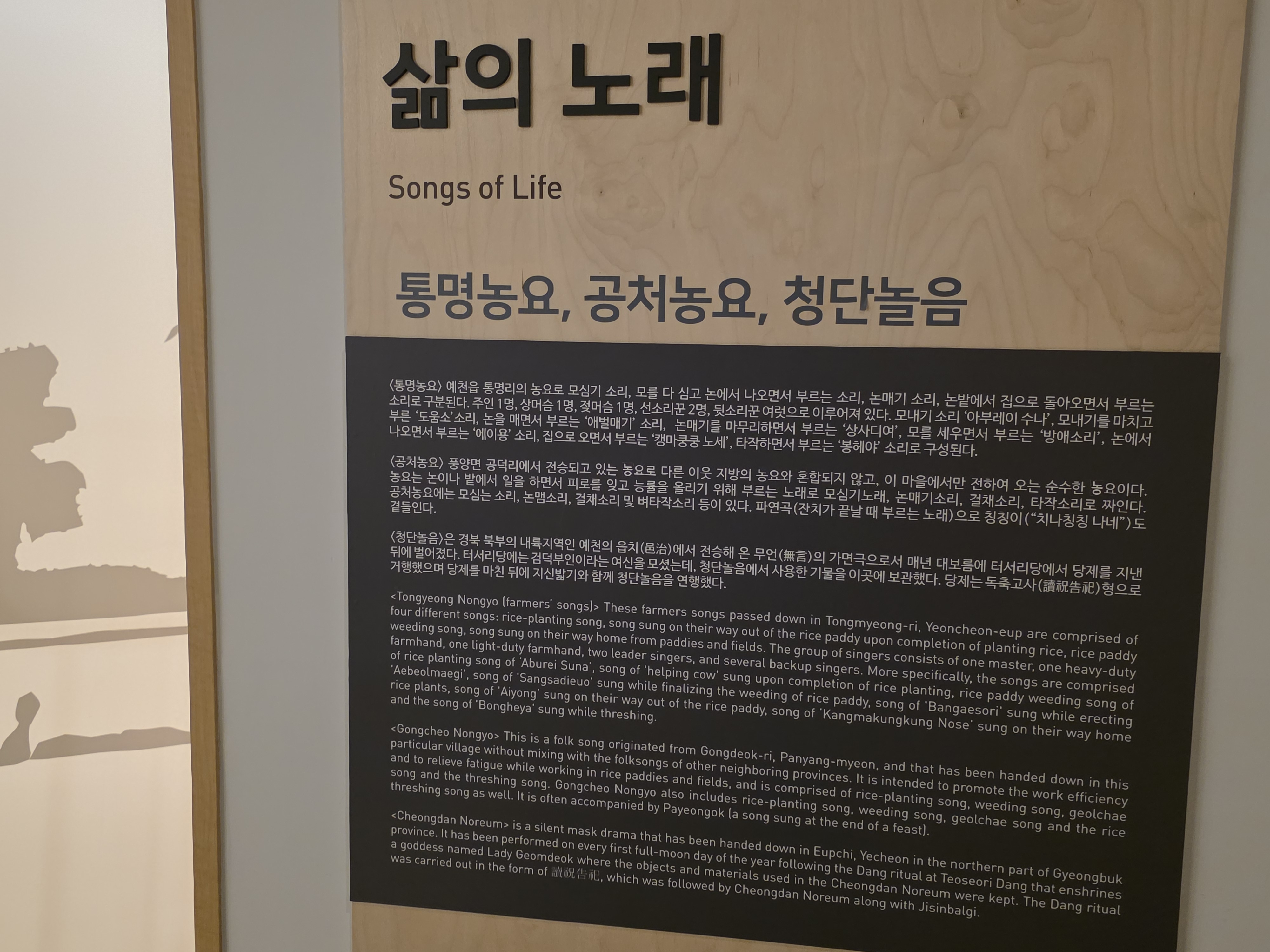 삶의 노래라는 이름의 농요들도 안내가 잘 되어 있습니다. 퉁명농요, 공처농요, 청단놀음입니다.