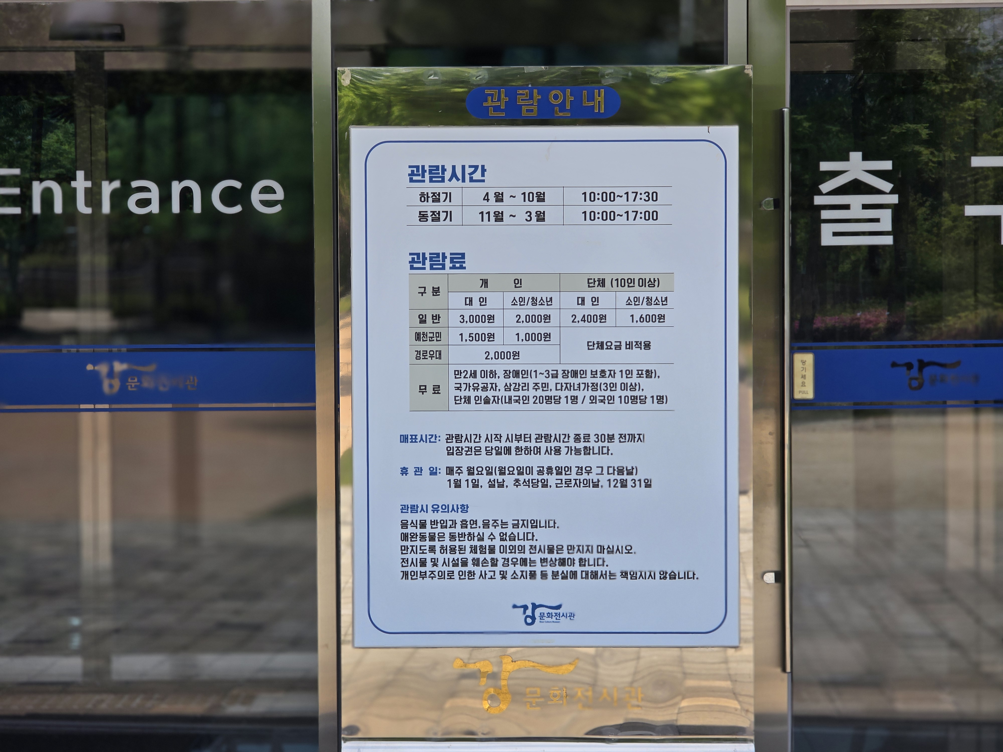 강문화전시관 입구에서 관람료 및 관람안내를 확인할 수 있습니다. 하절기와 동절기에 운영시간이 약간 차이가 있으니 참고해주세요.