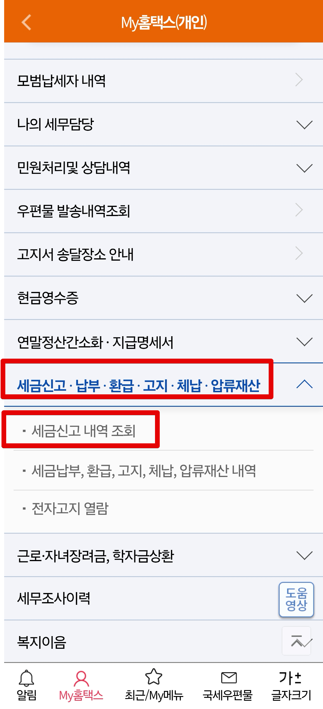 메뉴에서 [세금신고 납부 환급 고지 체납 압류재산] 항목에서 [세금신고 내역 조회]로 들어가면 양도소득세 신고 내역에 따른 금액이 잡혀있는걸 볼 수 있다.