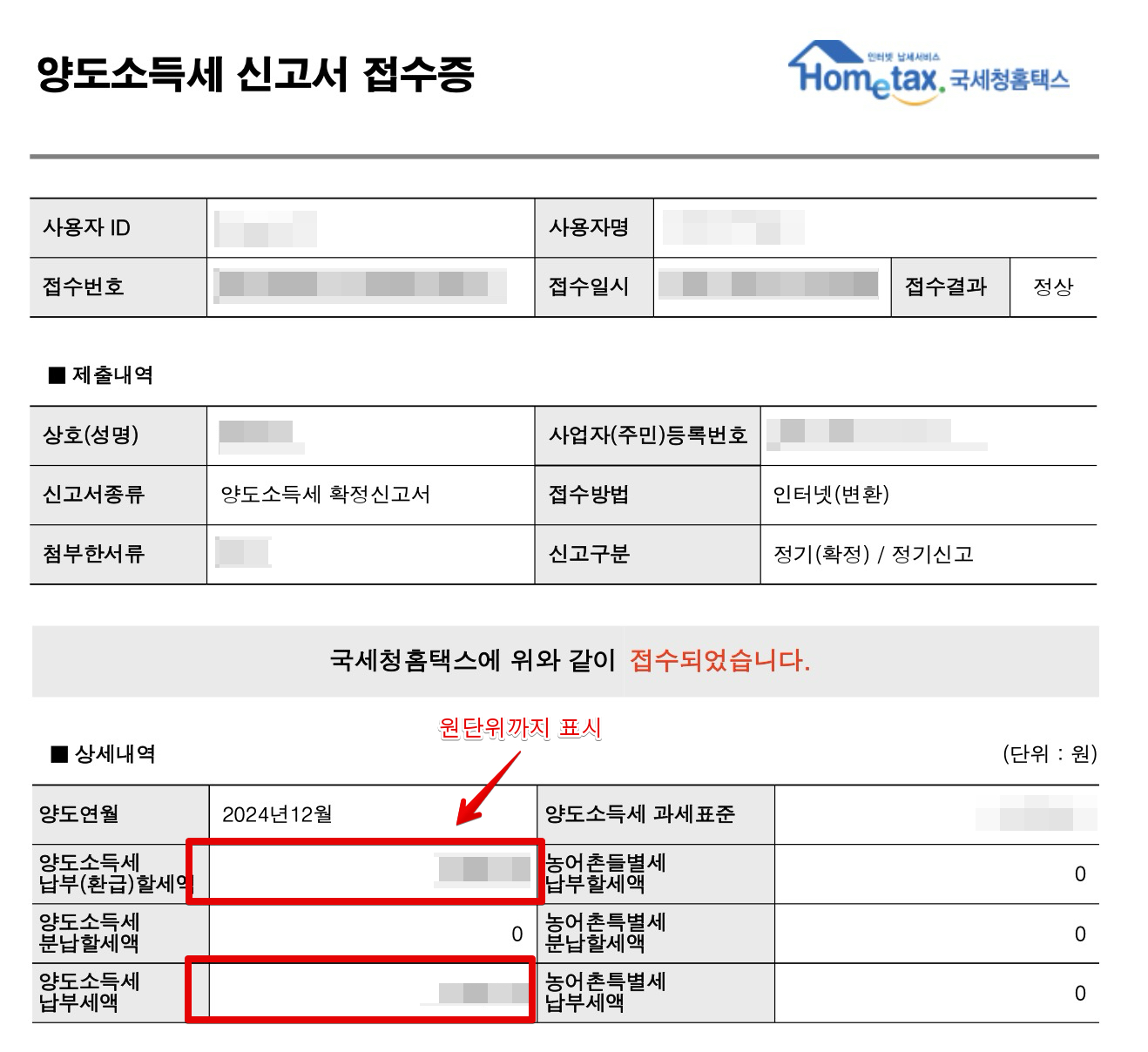 이렇게 이메일로 양도소득세 신고서 접수증을 준다. 여기에 양도소득세 납부할 세액을 보게되면 금액이 표시돼 있는데 원단위까지 표시되어 있다. 하지만 실제 납부는 원단위는 절사하고 납부하게 되니 이 부분만 기억하고 있으면 된다.