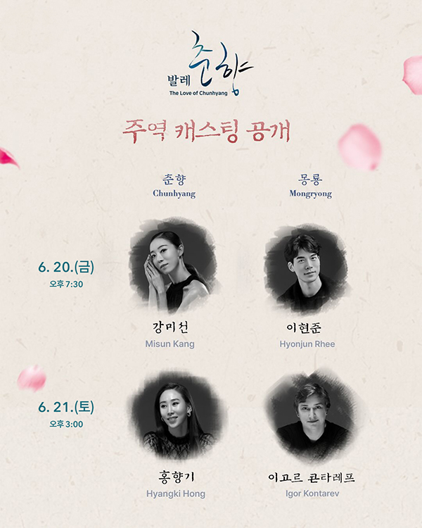 6월 20일 금요일에는 춘향에 강미선, 몽룡에 이현준님이, 21일에는 춘향에 홍향기, 몽룡에 이고르 콘타레프가 주역으로 나섭니다.