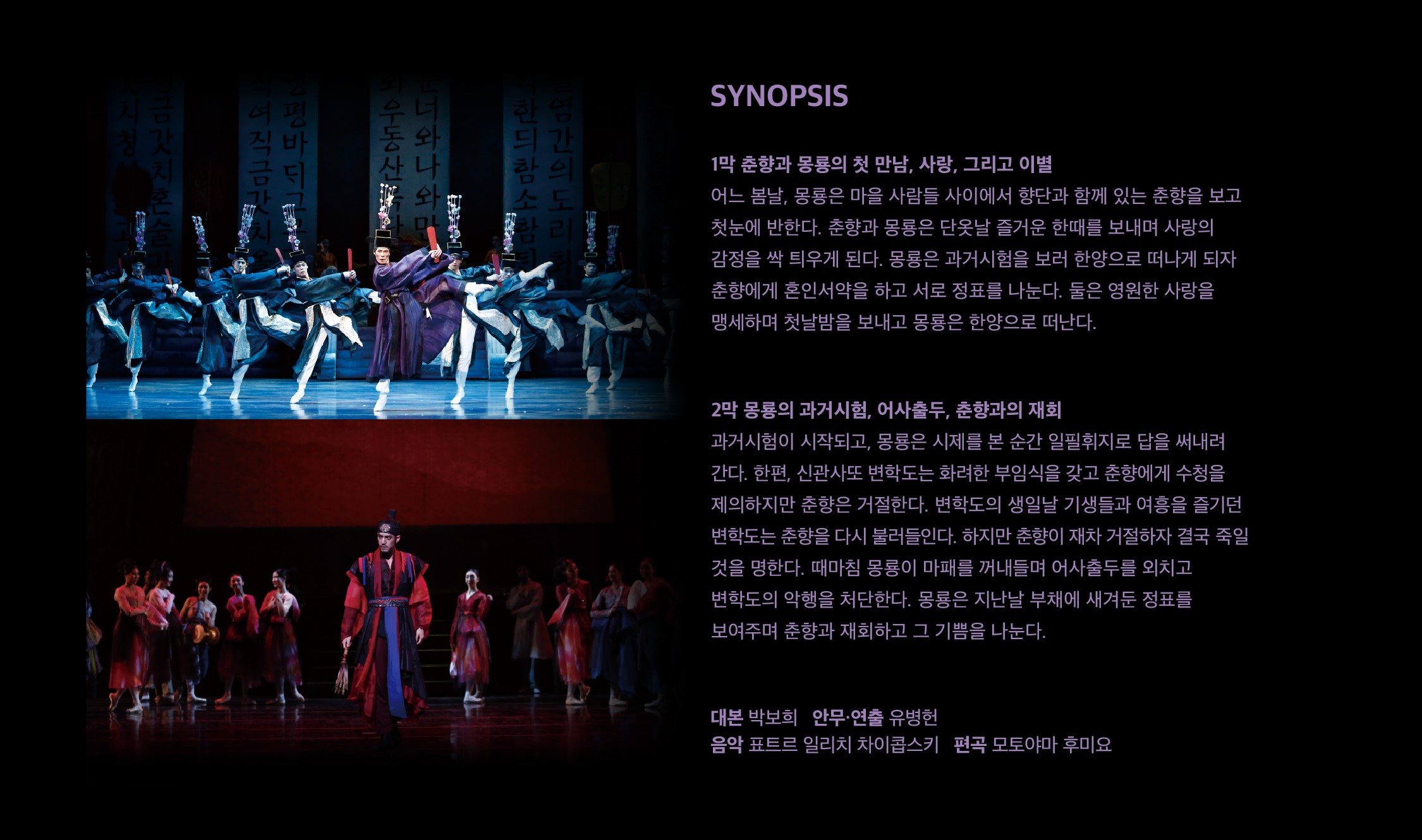 1막 춘향과 몽룡의 첫 만남, 사랑, 그리고 이별 어느 봄날, 몽룡은 마을 사람들 사이에서 향단과 함께 있는 춘향을 보고 첫눈에 반한다. 춘향과 몽룡은 단옷날 즐거운 한때를 보내며 사랑의 감정을 싹 틔우게 된다. 몽룡은 과거시험을 보러 한양으로 떠나게 되자 춘향에게 혼인서약을 하고 서로 정표를 나눈다. 둘은 영원한 사랑을 맹세하며 첫날밤을 보내고 몽룡은 한양으로 떠난다.