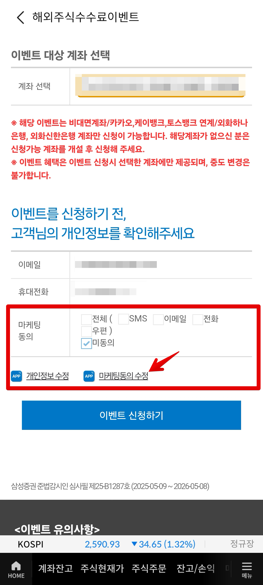 이벤트 페이지에서 [이벤트 신청하기] 버튼을 클릭해서 신청하면서 진행한다. 처음 가입할 때 마케팅 동의에 체크해제하고 진행했었는데 이벤트 참여 등에서는 마케팅 동의에 동의한 사람에게만 혜택을 제공하는 경우가 거의 전부이므로 이벤트 신청할 땐 마케팅 동의를 꼭 해주어야한다. 이후 이벤트 신청 완료하고 정상신청되었다는 메시지와 함께 미국주식 무료체험 종료일 날짜를 확인해주면 된다. 신청일로부터 3개월이다. 짧은 기간 수수료 무료 자체는 약간의 도움은 될 수 있지만, 적립식으로 장기투자하는 사람들에겐 사실 큰 영향은 없는 것 같다.