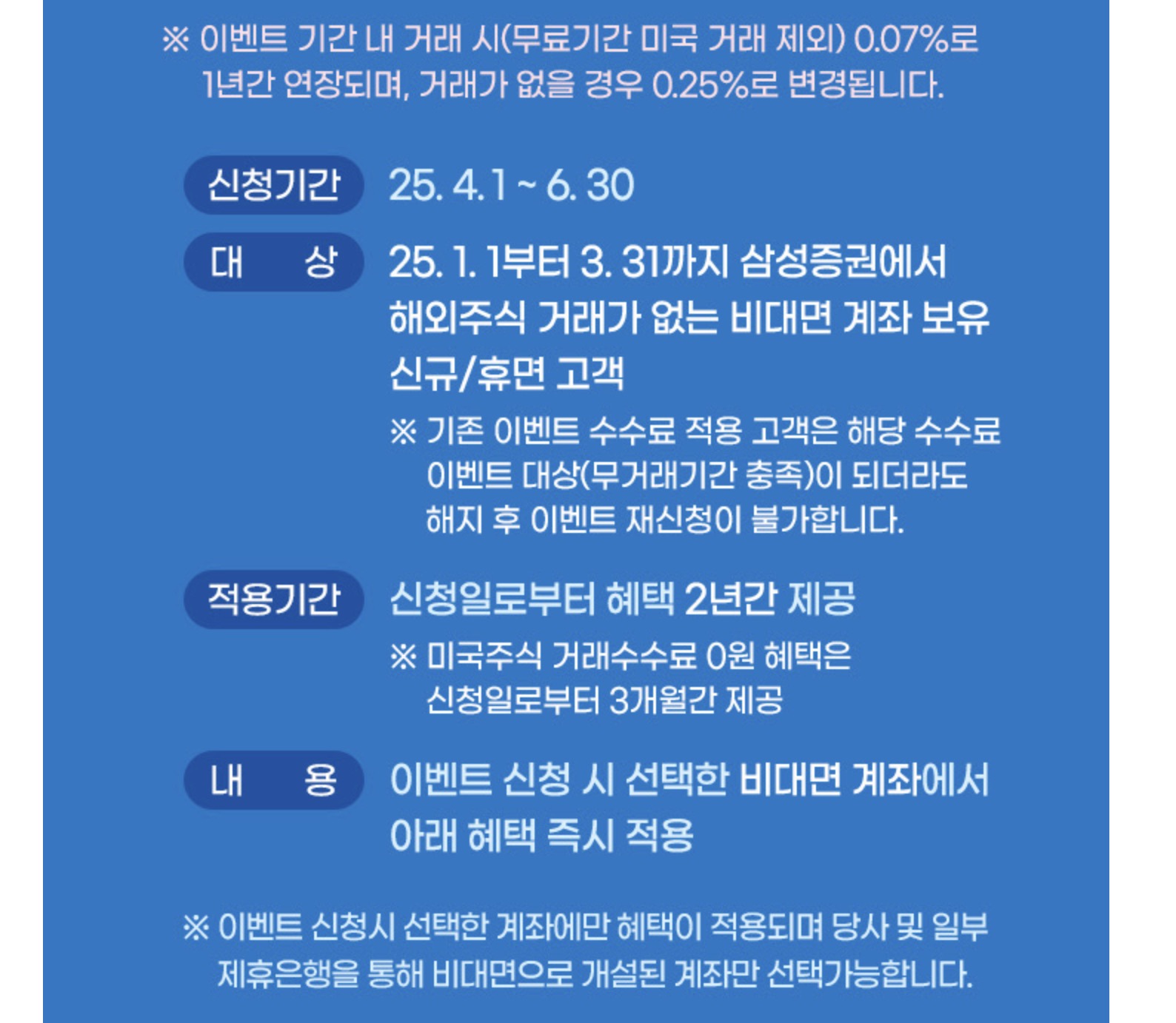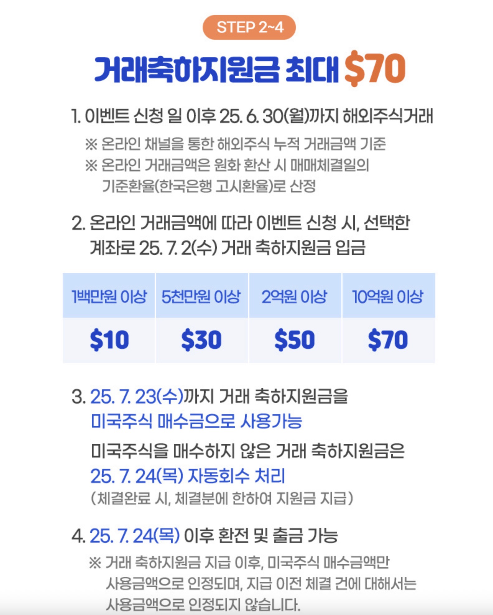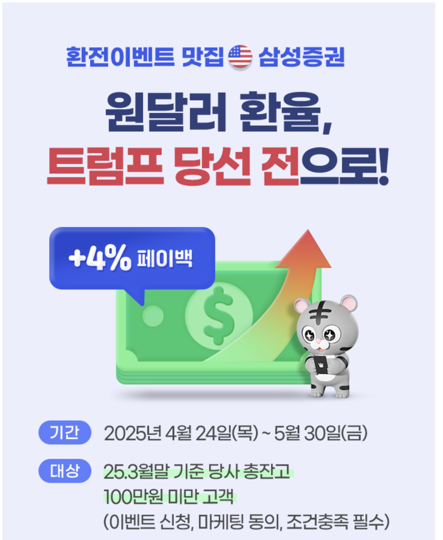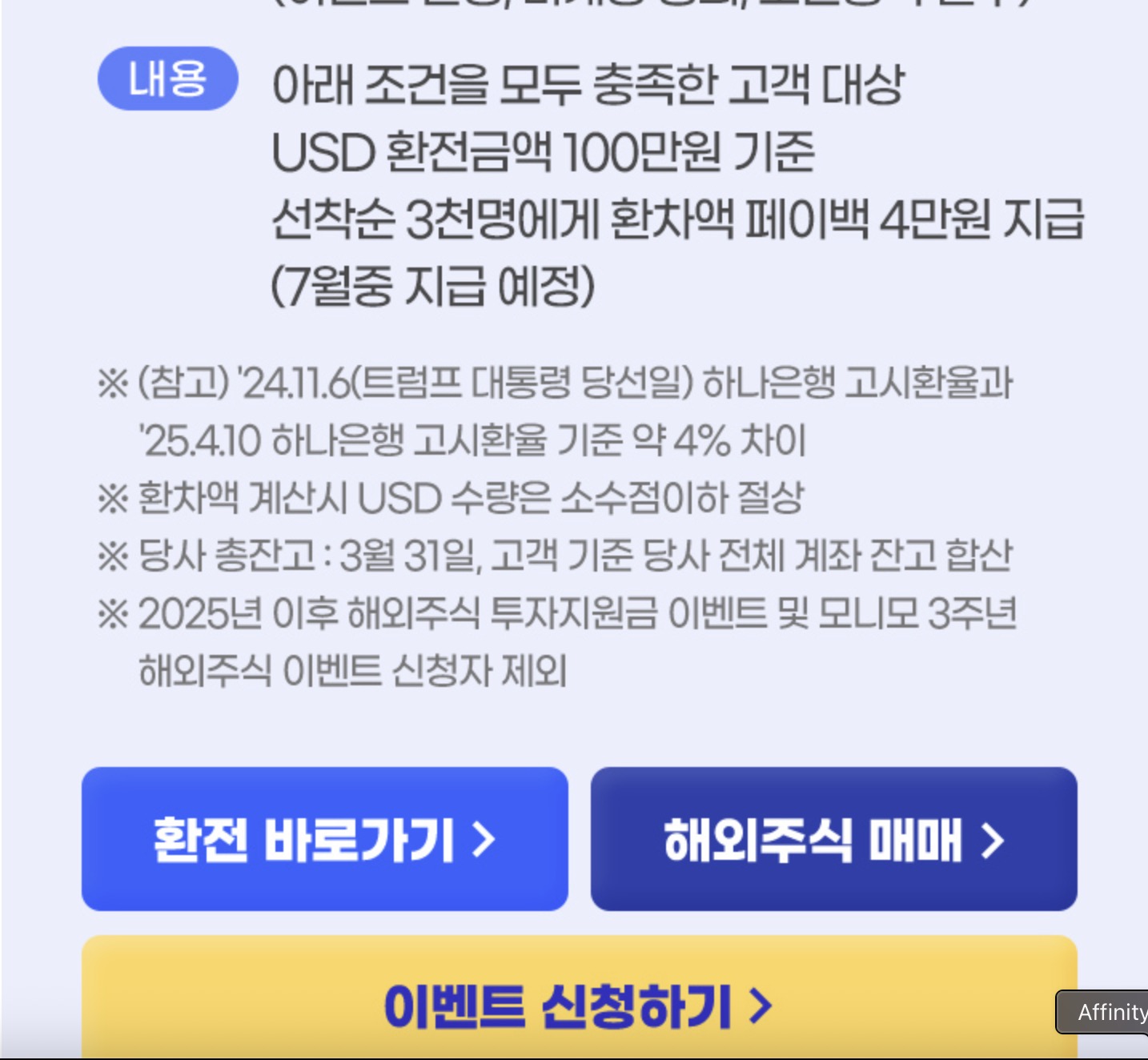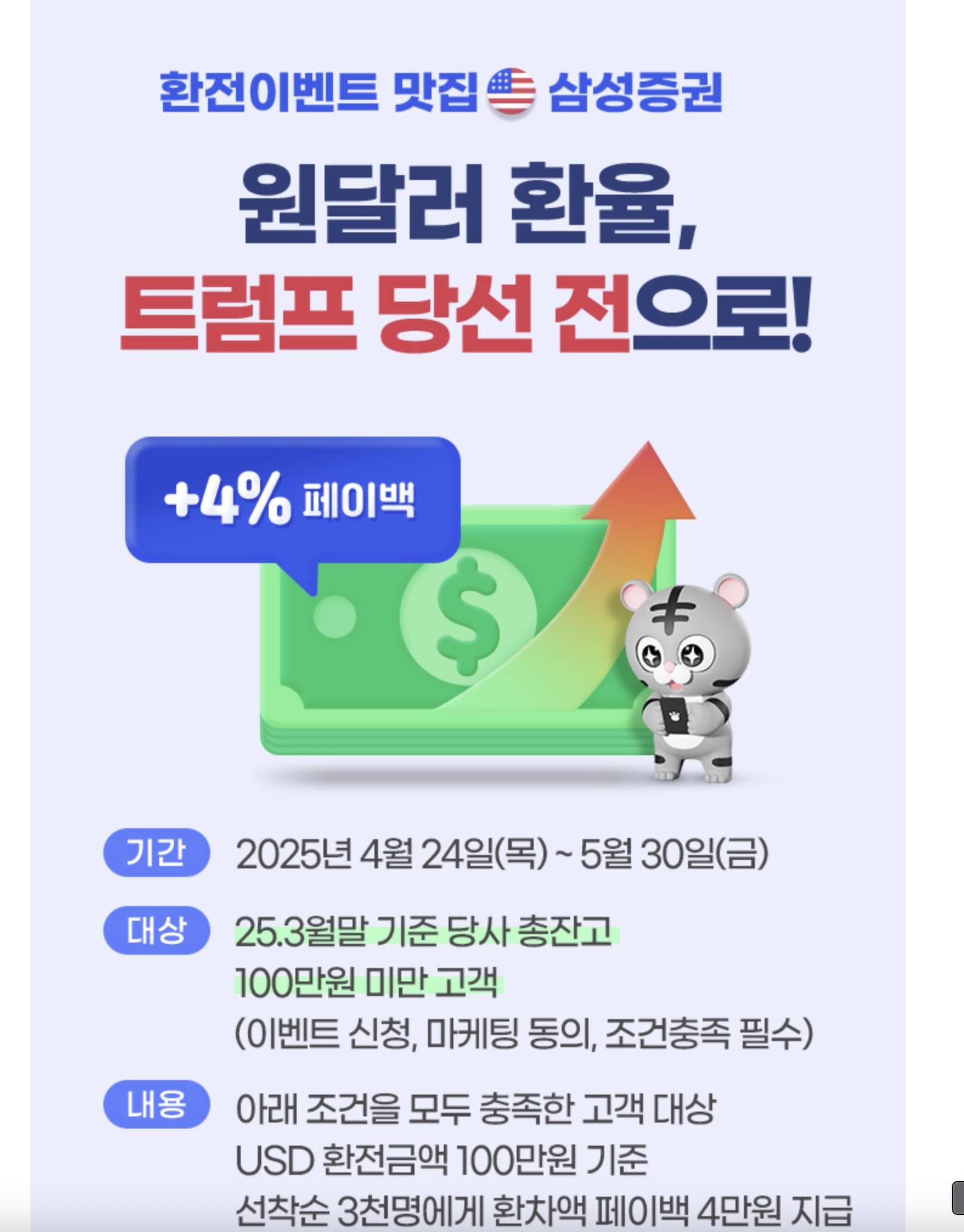 해당 이벤트는 25년 3월말 기준 삼성증권 총잔고 100만원 미만 고객만 신청할 수 있는 이벤트인데 나의 경우 4월에 삼성증권 계좌를 개설했으니 참여대상이 된다고 보고 있다. 맞는진 모르겠다. 아무튼 USD 달러 환전 금액 100만원 기준으로 선착순 3천명에게 환차액 페이백 4만원을 지급하는 이벤트다. 그런데 밑에 읽어보니까 2025년 이후 해외주식 투자지원금 이벤트 신청자는 제외된다고해서이 이벤트는 신청은 했는데 대상에서 빠질 것 같다. 어차피 선착순이라서 안될 가능성도 있었어서 이 부분은 그냥 패스.