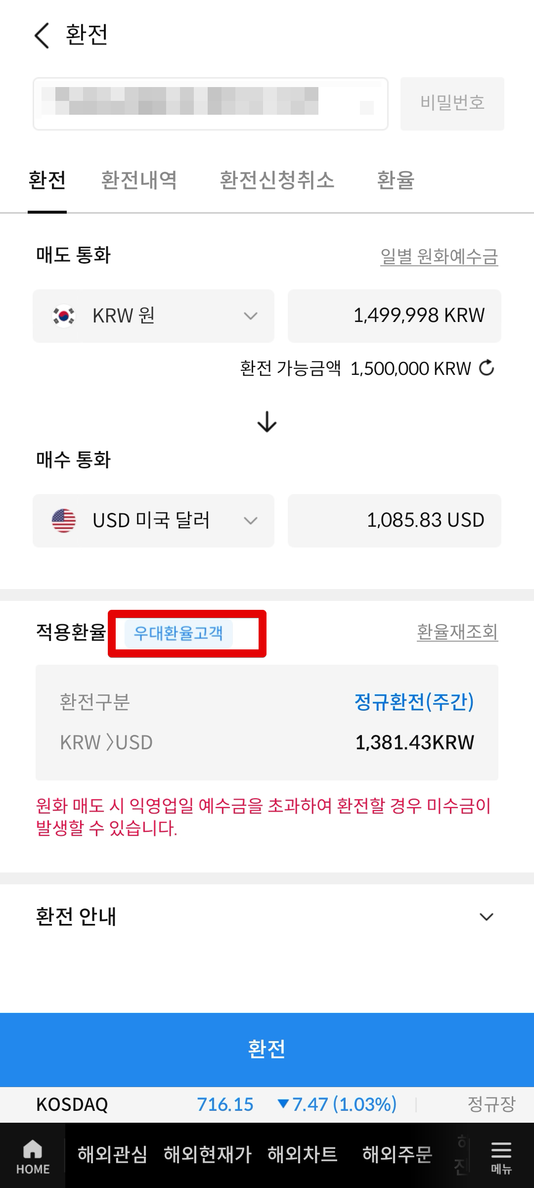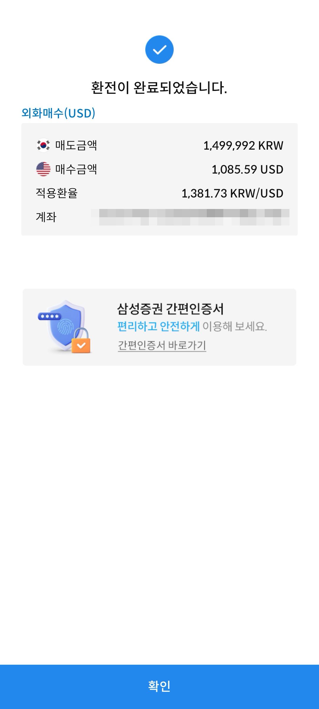 원화 150만원을 곧바로 삼성증권에서 환전신청하면서 환율우대 95%가 붙어있는지 직접 테스트로 확인해보았다. 150만원을 환전했을 경우, 환율 1381원 적용시 대략 1085달러 정도가 만들어지면 환율우대 95% 정도라고 볼 수 있는 것 같다.