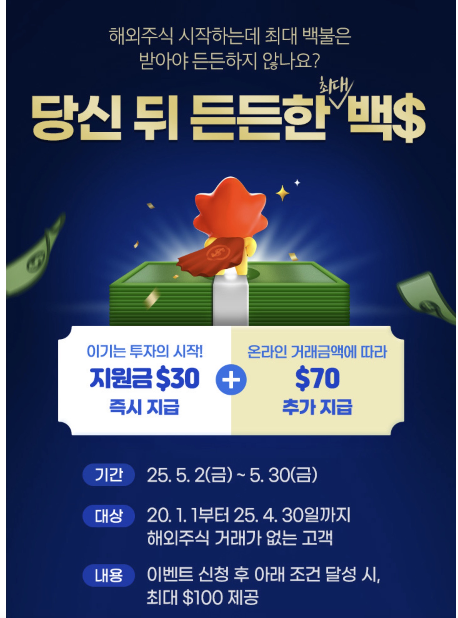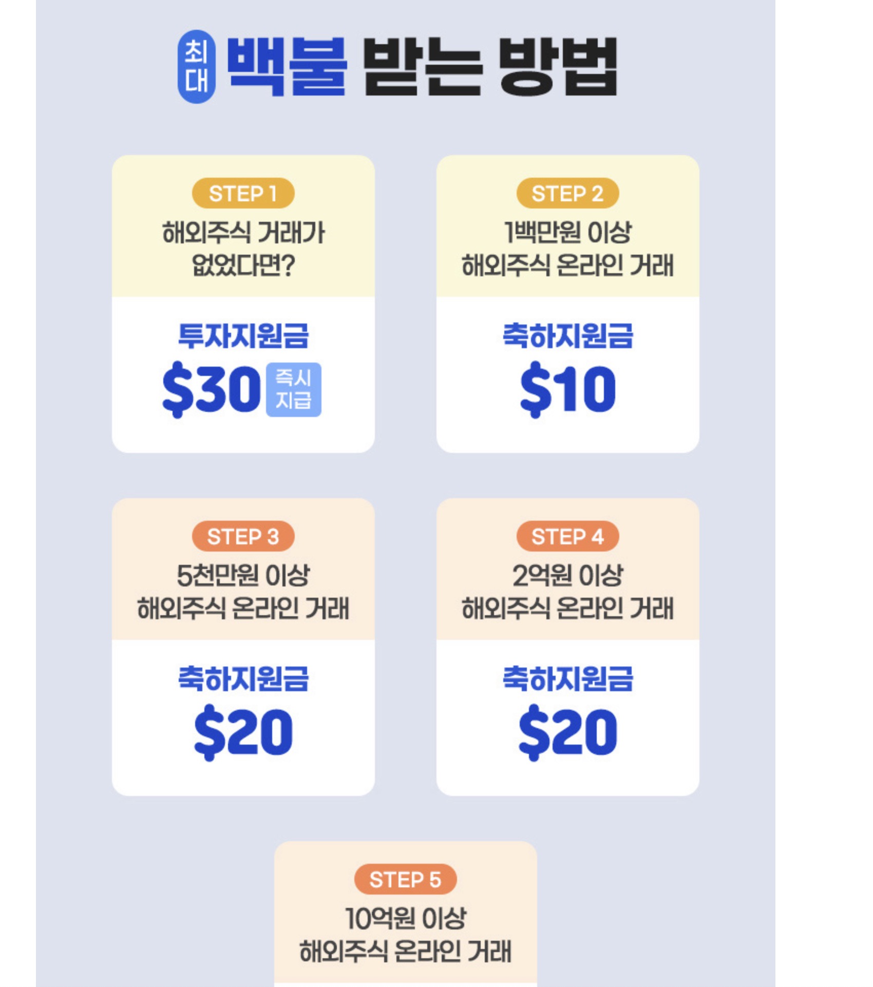 최대 100불을 준다고 돼 있지만 현실적으로 100불을 다 받기는 힘들어보이는데 왜냐하면 10억원 이상 해외주식 온라인 거래를 일으켜야하기 때문이다...ㅋㅋ 그래서 현실적으로 받을 수 있다고 보여지는 STEP 2번 항목, 1백만원 이상 해외주식 온라인 거래를 통한 축하지원금 $10를 목표로 진행해보았다. 이렇게되면 최초 즉시지급하는 투자지원금 $30과 축하지원금 $10를 더해서 총 $40을 받을 수 있다.