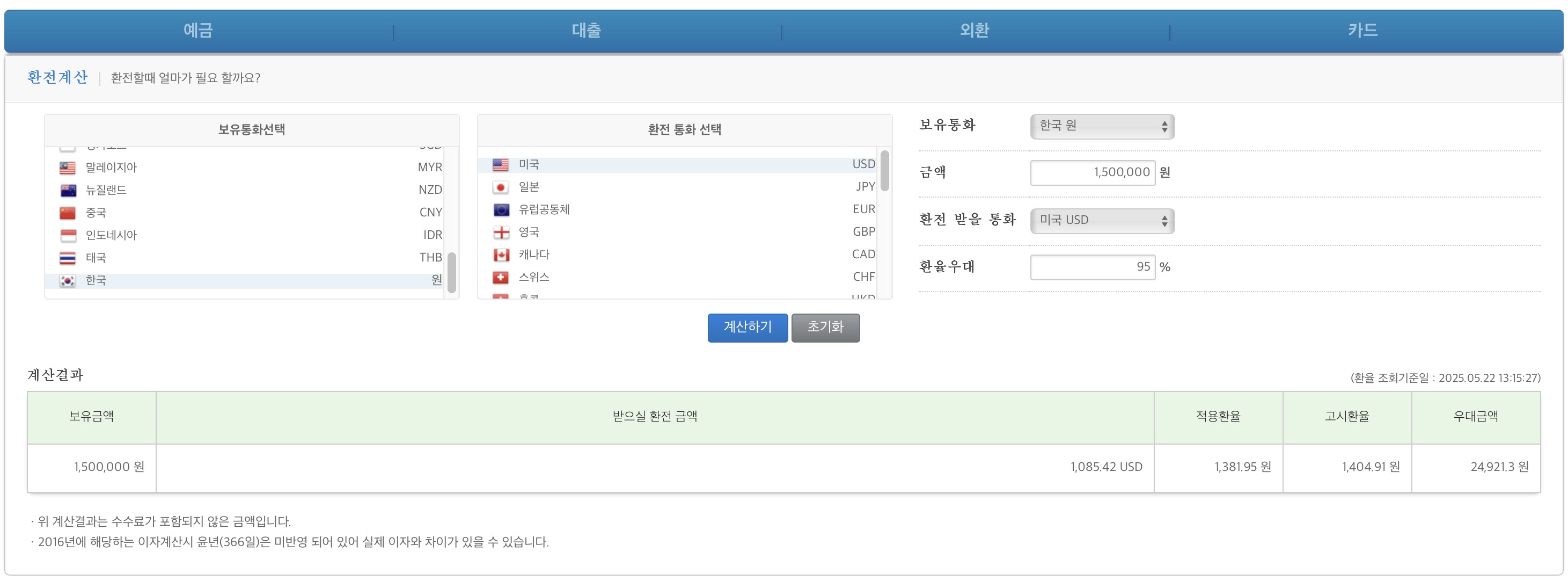 현금 150만원-2원 환전시 환율 1381.43원 적용하고 1085.59 달러로 환전되었다. 확인 완료.