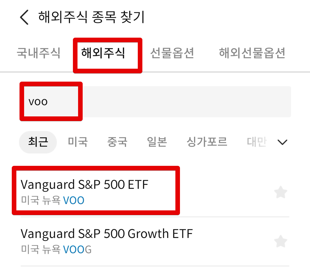 종목찾기 검색창을 이용해서 VOO 티커를 입력해서 VOO 상품을 찾아준다. 미국주식들의 경우 파생상품들이 많기 때문에 초보자분들은 쉽게 헷갈려서 엉뚱한 상품을 매수하는 경우도 나는 많이 보았다. 예를들어 VOOG가 있고 VOO가 있다. 상품 구성이나 수수료 등의 내용이 다르므로 꼭 정확한 티커를 사야한다. 예를들어 VOO가 아니라 VOOG ETF의 경우 이름에서도 알 수 있듯이 성장주 중심의 ETF다. 나는 시가총액가중방식을 사용하는 전체 지수추종 ETF가 아닌 스마트베타 방식의 모든 ETF는 절대로 매수하지 않는다는 원칙으로 투자하고 있다.