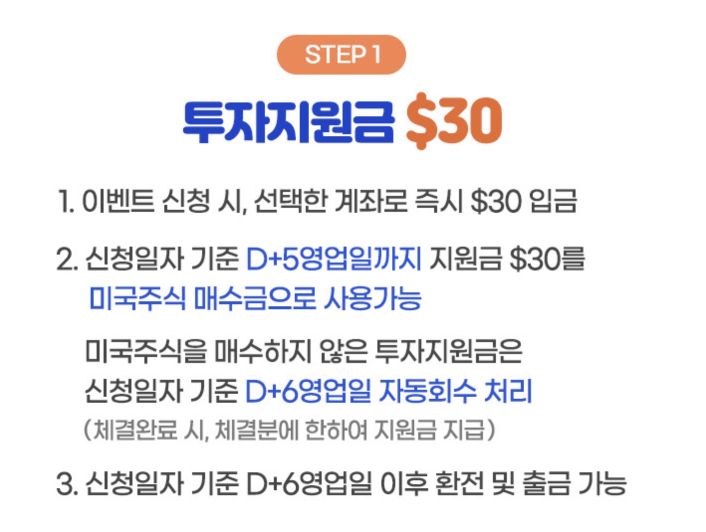 해당 이벤트를 신청하자마자 곧바로 계좌로 $30를 증거금으로 넣어준다. 신청일자 기준 D+5일까지 미국주식 매수금으로 사용가능한 금액이다. 해당 금액을 미국주식 매수에 쓰지 않으면 자동회수 처리되니까 무조건 사야한다고 보면 된다.
