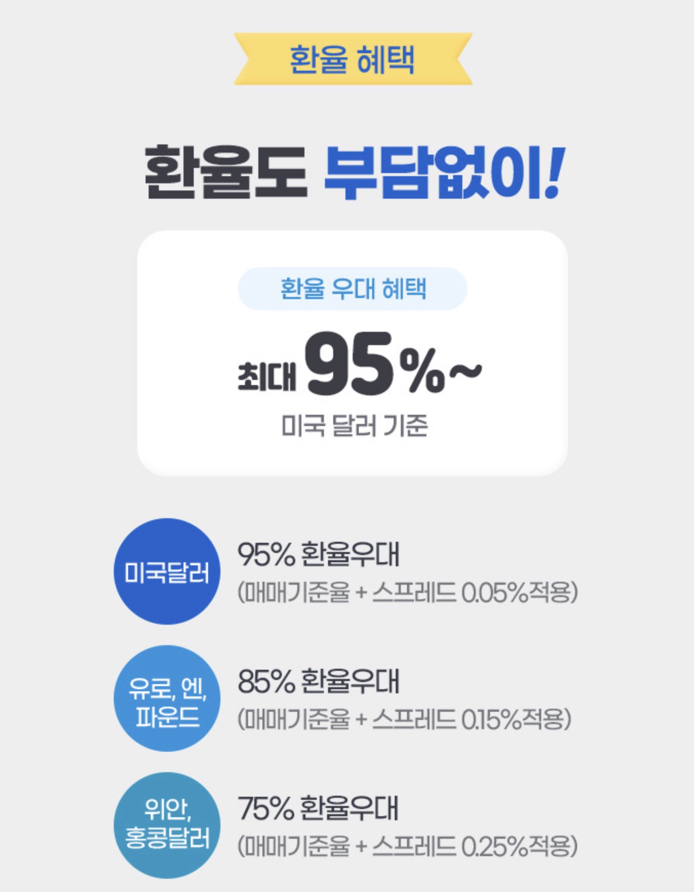 해당 이벤트에 환율 혜택도 함께 붙어있다. 환율 우대 미국 달러 기준 95%를 제공한다. 이벤트 신청일로부터 2년간 적용해주고 혜택기간동안 거래 있으면 1년 연장해준다. 혜택기간동안 거래가 없을 경우 환율 우대는 미적용한다고 한다.
