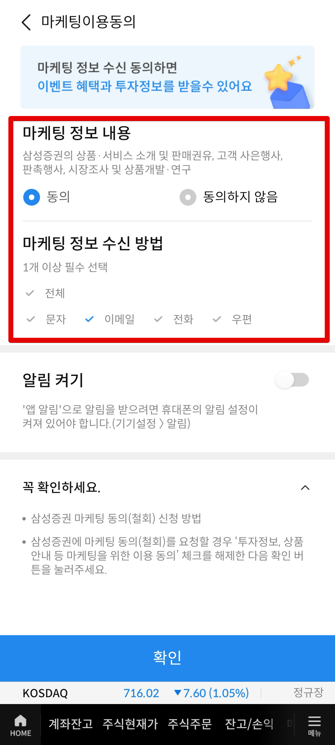 이벤트 페이지에서 [이벤트 신청하기] 버튼을 클릭해서 신청하면서 진행한다. 처음 가입할 때 마케팅 동의에 체크해제하고 진행했었는데 이벤트 참여 등에서는 마케팅 동의에 동의한 사람에게만 혜택을 제공하는 경우가 거의 전부이므로 이벤트 신청할 땐 마케팅 동의를 꼭 해주어야한다. 이후 이벤트 신청 완료하고 정상신청되었다는 메시지와 함께 미국주식 무료체험 종료일 날짜를 확인해주면 된다. 신청일로부터 3개월이다. 짧은 기간 수수료 무료 자체는 약간의 도움은 될 수 있지만, 적립식으로 장기투자하는 사람들에겐 사실 큰 영향은 없는 것 같다.