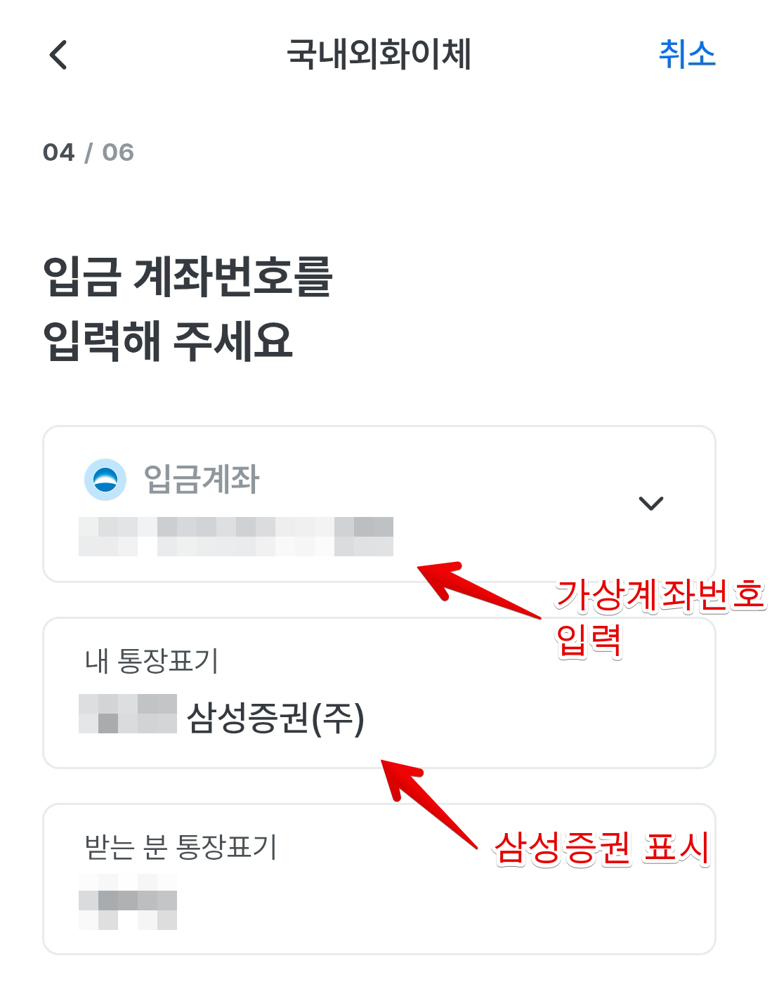 이체대상에 우리은행 + 외화가상계좌번호를 적어주면 된다. 이렇게하면 받는쪽에는 내 이름이, 내 통장표기에는 이름+삼성증권(주)로 표시되어 삼성증권임을 알려주게 된다.